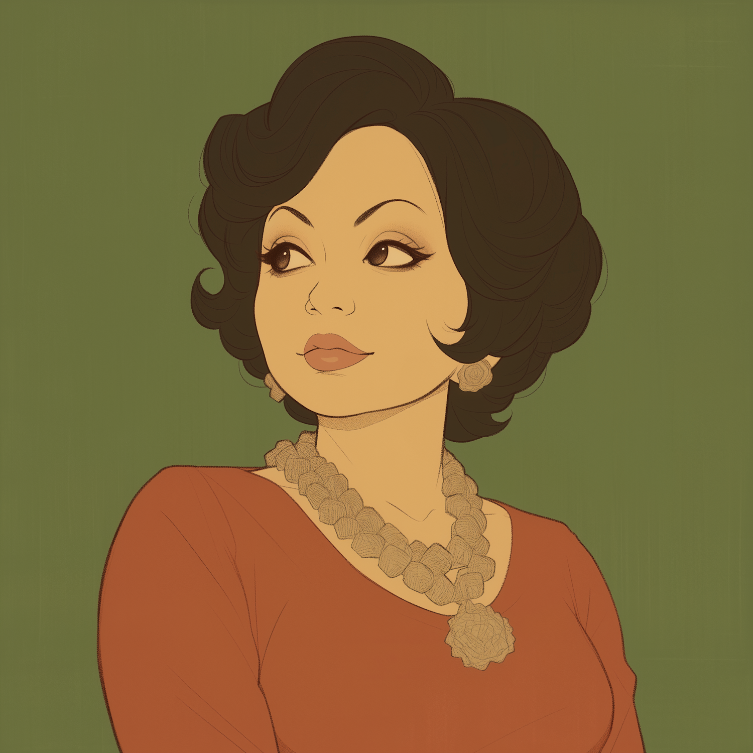 Stylized vintage illustration of a woman with dark hair, red dress, and floral jewelry against a muted green background.