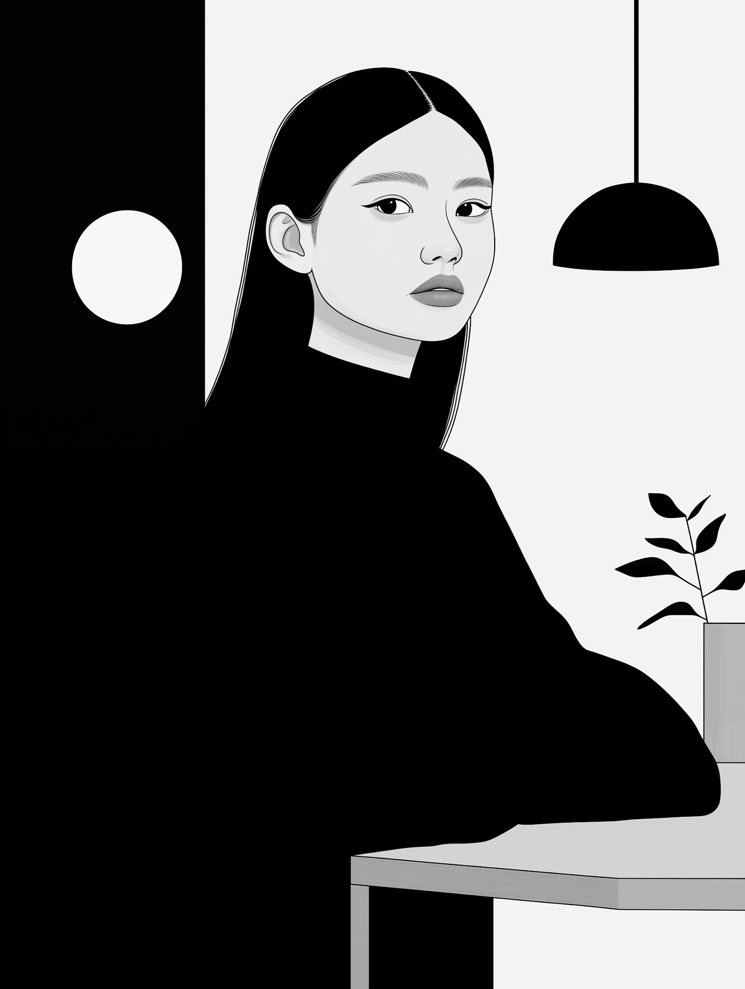 Minimalist black and white illustration of an Asian woman with long hair, wearing a turtleneck, seated by a table with a plant.
