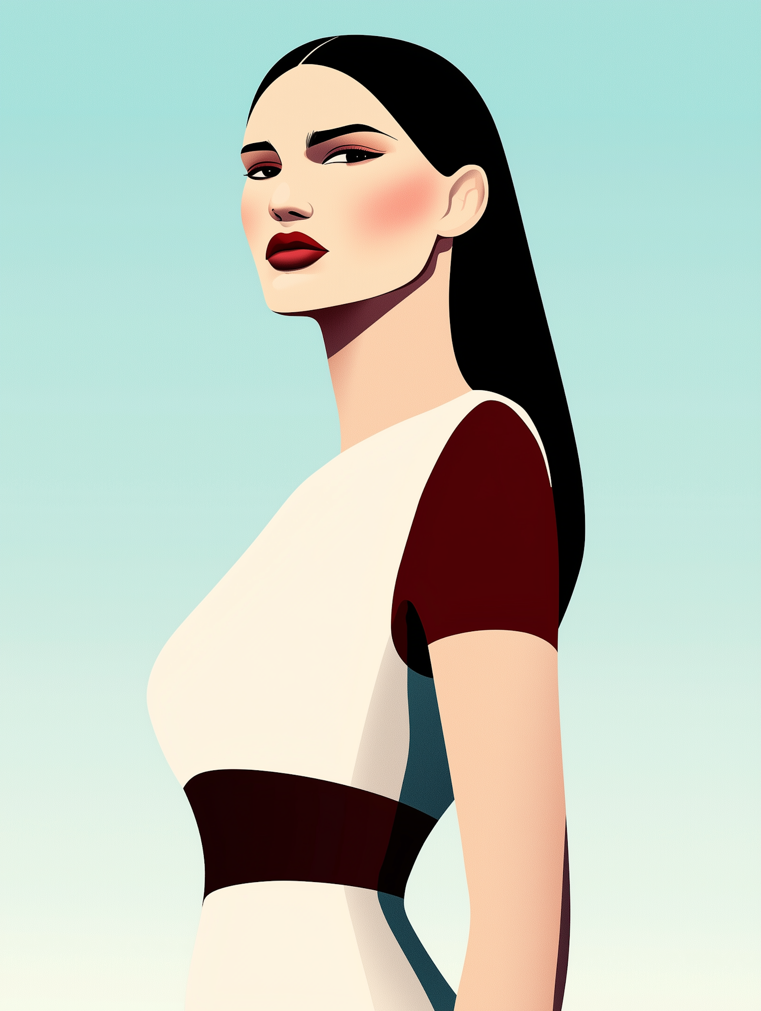 Stylized illustration of a confident woman with sleek black hair and bold red lips against a soft blue background.
