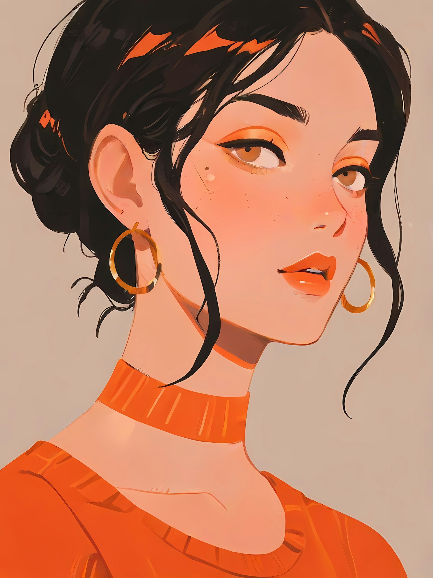 Stylish digital illustration of a woman with dark hair, gold hoop earrings, and an orange outfit, set against a soft beige background.
