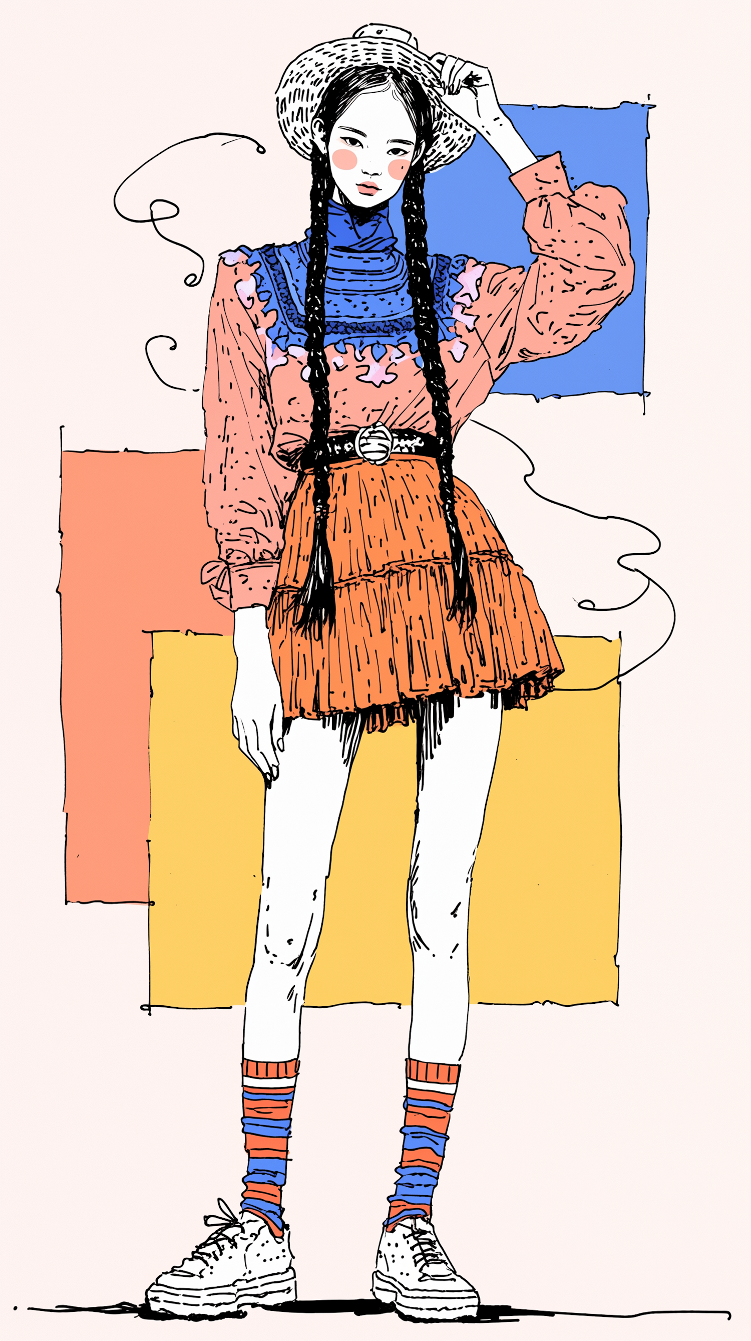 Stylized illustration of a fashionable woman in a colorful outfit with braids and a hat, set against a vibrant abstract background.