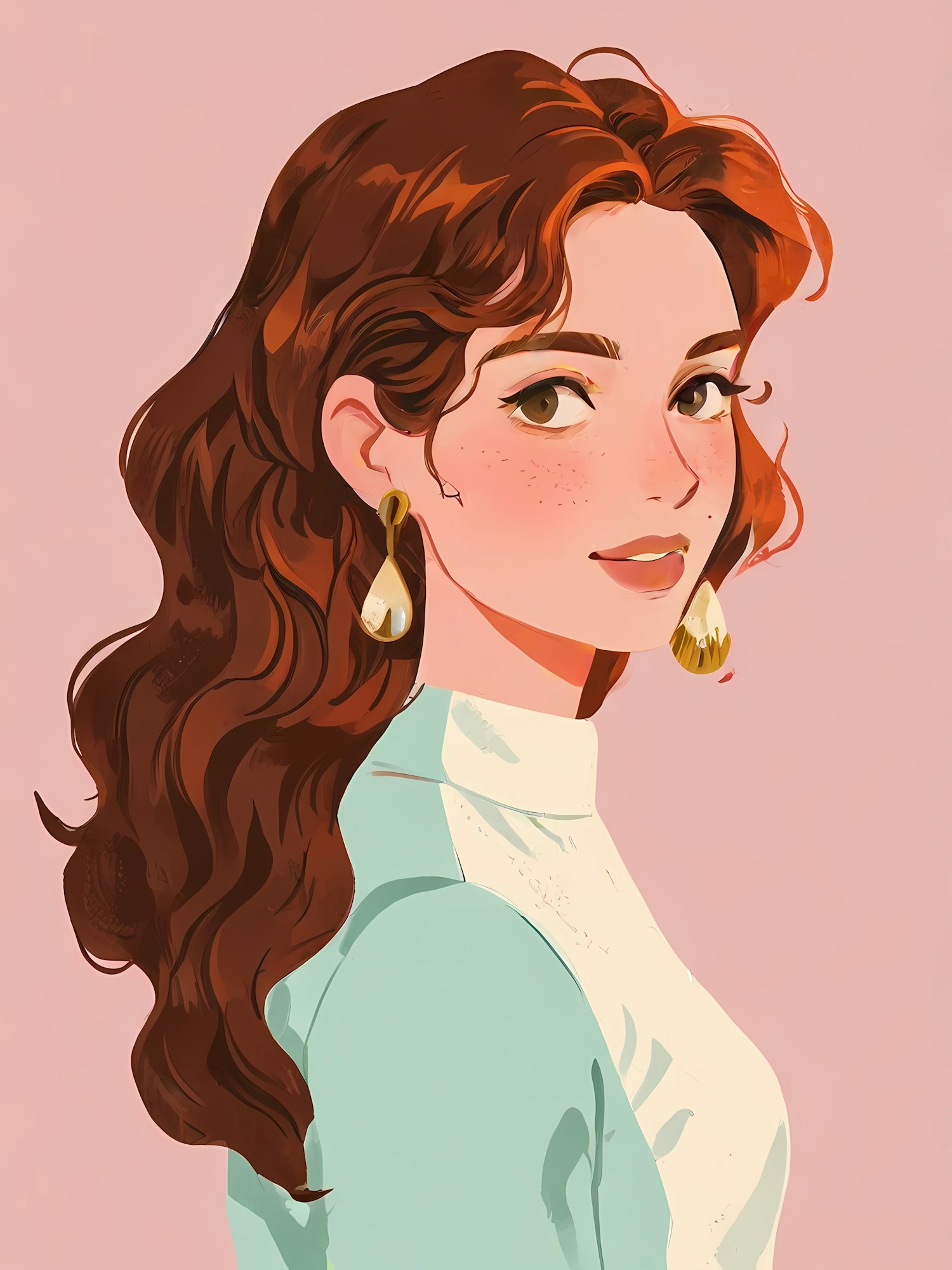 Elegant illustration of a young woman with wavy brown hair, wearing teardrop earrings and a light blue top against a soft pink background.