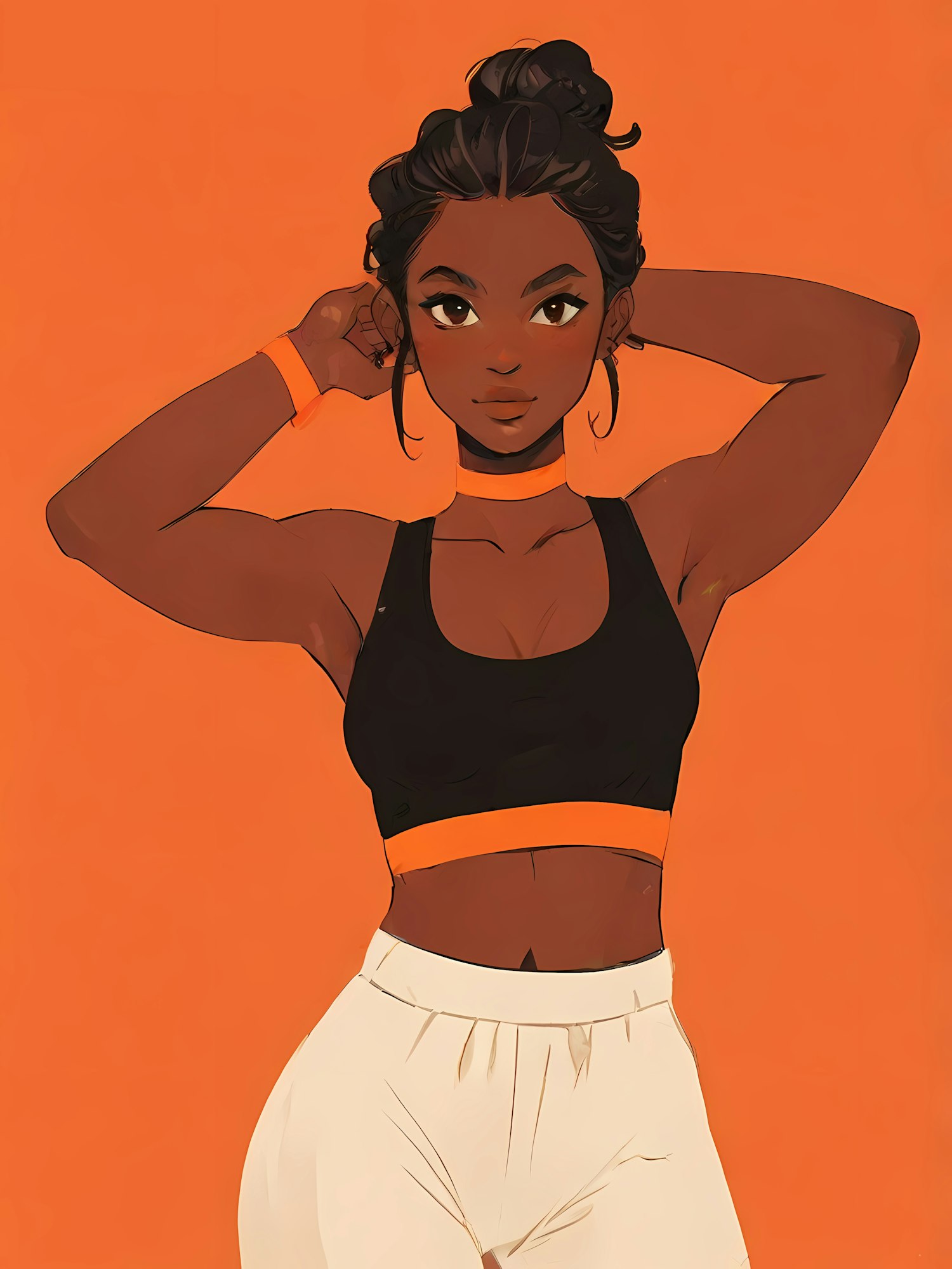 Stylized illustration of a confident woman in a black crop top and white pants, set against a vibrant orange background.