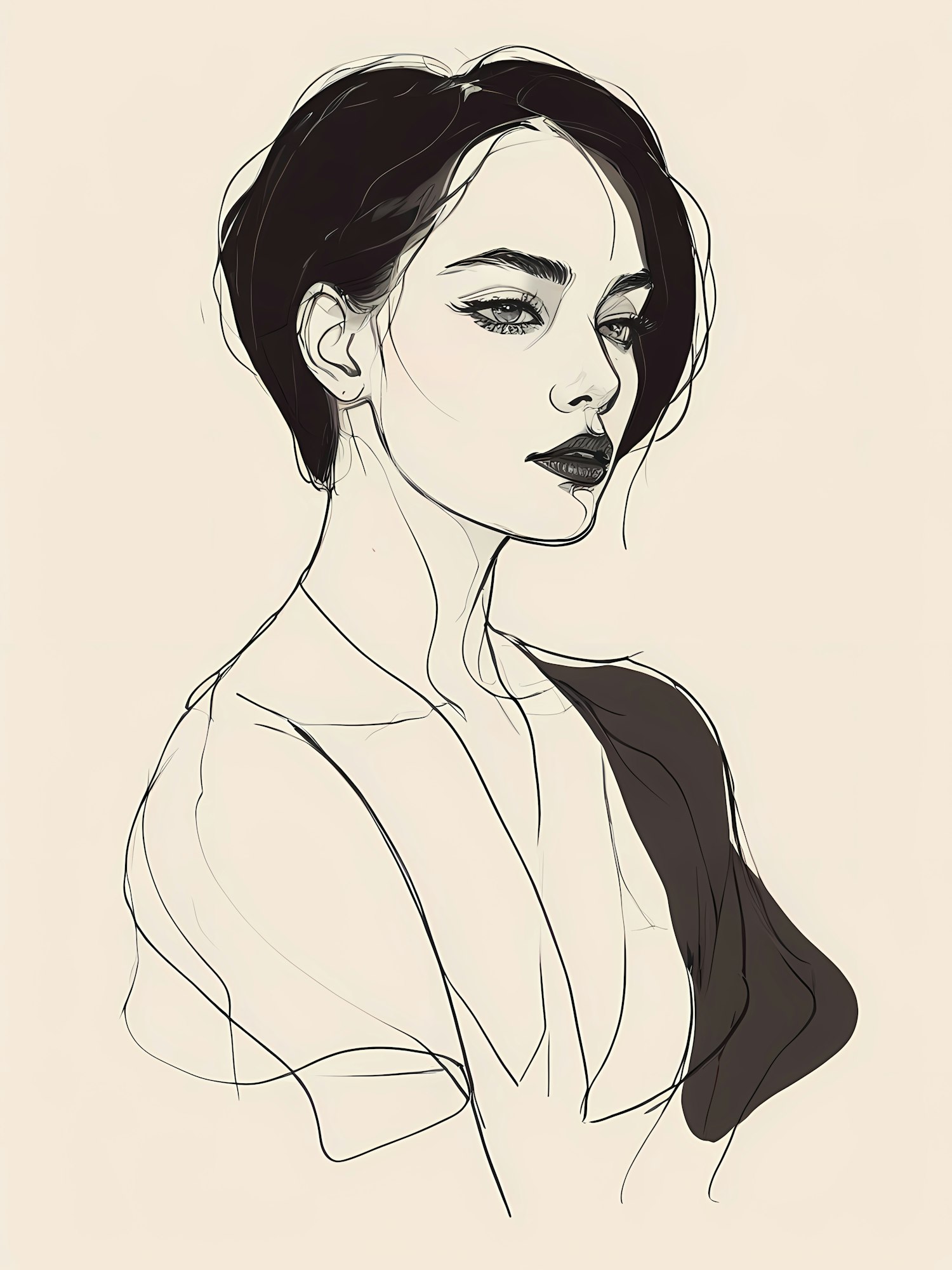 Elegant illustration of a woman with dark hair and expressive eyes, set against a light beige background. Minimalist and graceful design.