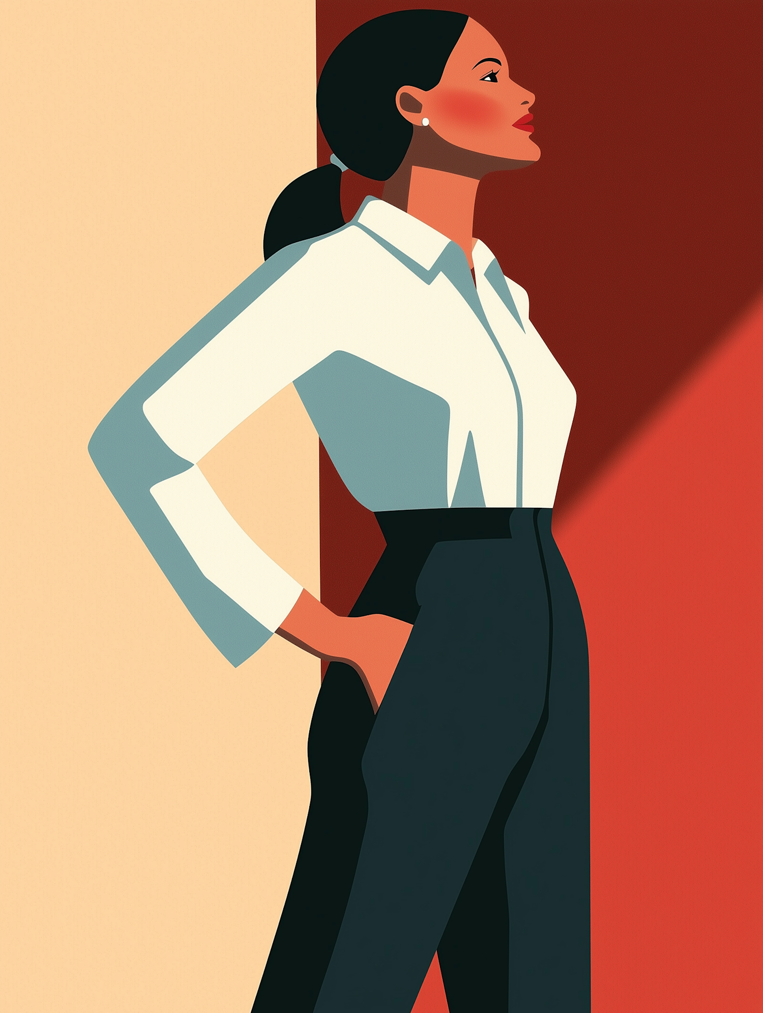 Stylized illustration of a confident woman in a white blouse and dark pants, set against a beige and terracotta background.