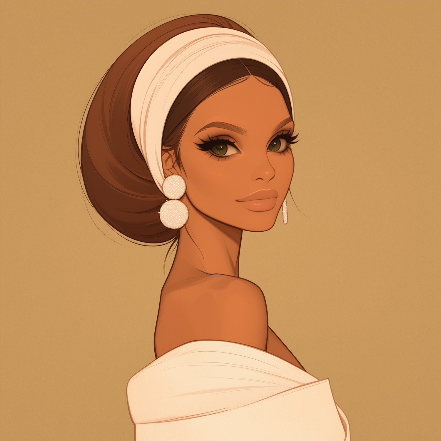 Elegant illustration of a woman with green eyes, white headband, and earrings, set against a beige background. Stylish and sophisticated.