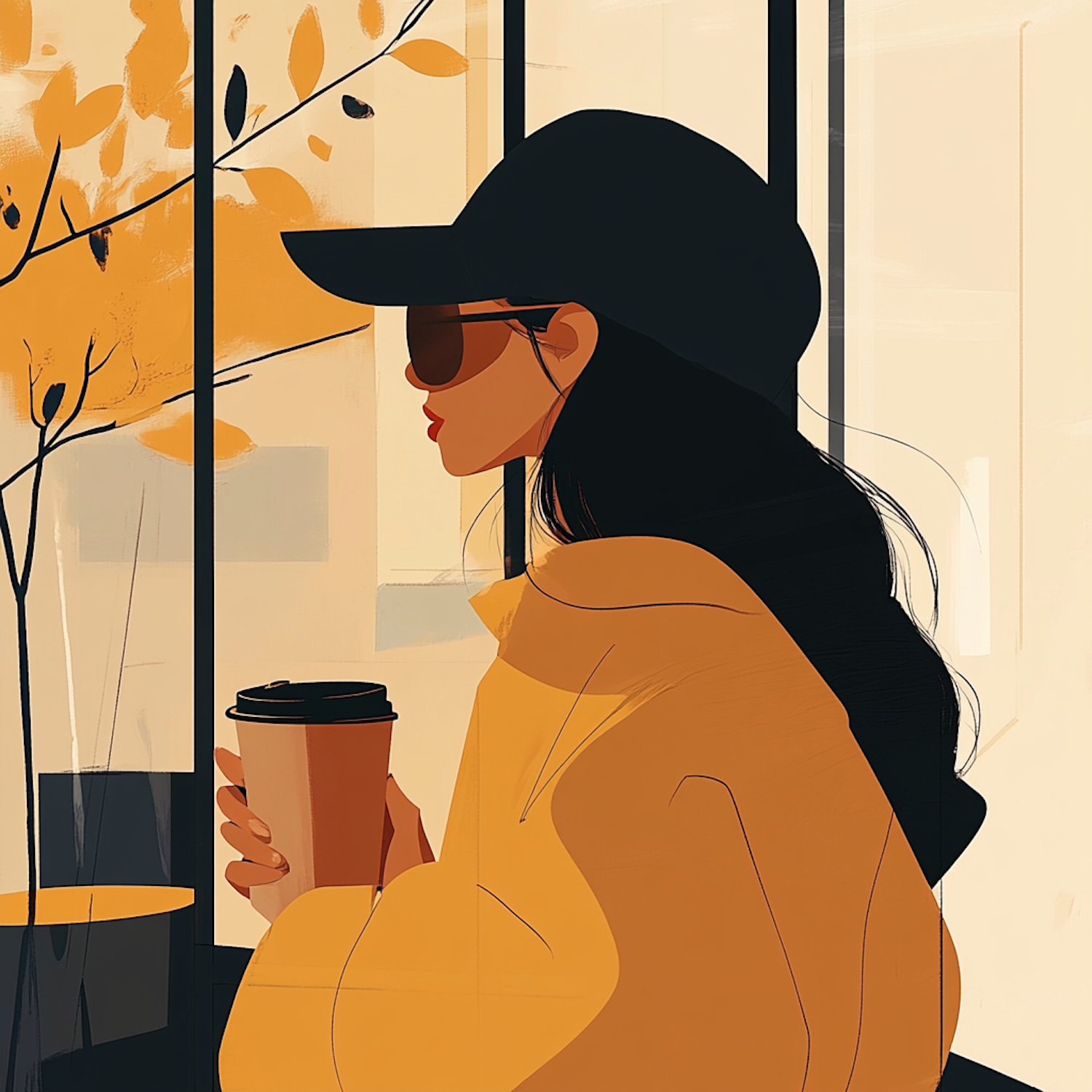 Stylized illustration of a woman in a yellow coat, black cap, and sunglasses holding coffee, set against a warm autumn backdrop.