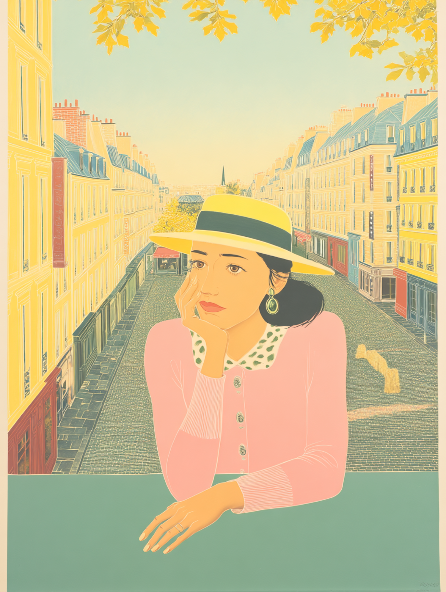 Stylized illustration of a woman in a yellow hat, sitting thoughtfully in a European street with pastel buildings and autumn leaves.