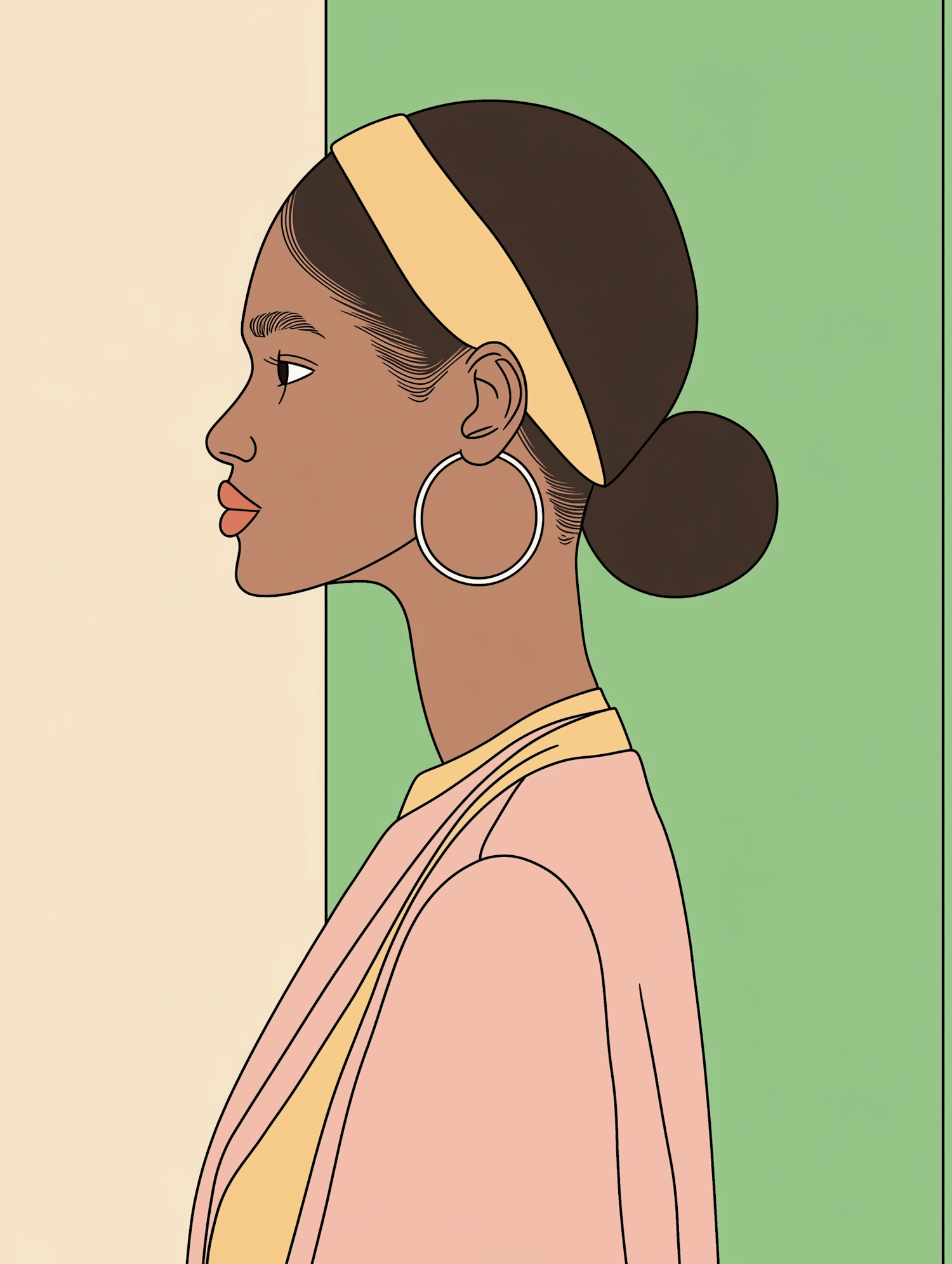 Stylized illustration of a Black woman in profile with a yellow headband, hoop earrings, and a pink jacket against a cream and green background.