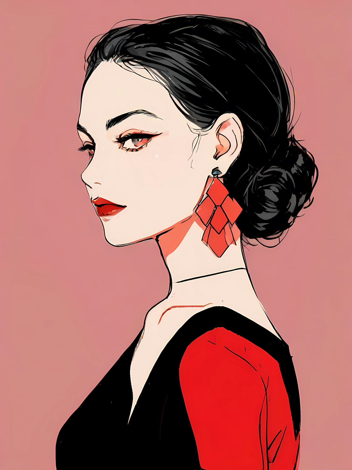 Stylized illustration of a woman with dark hair, red earrings, and bold makeup against a soft pink background.
