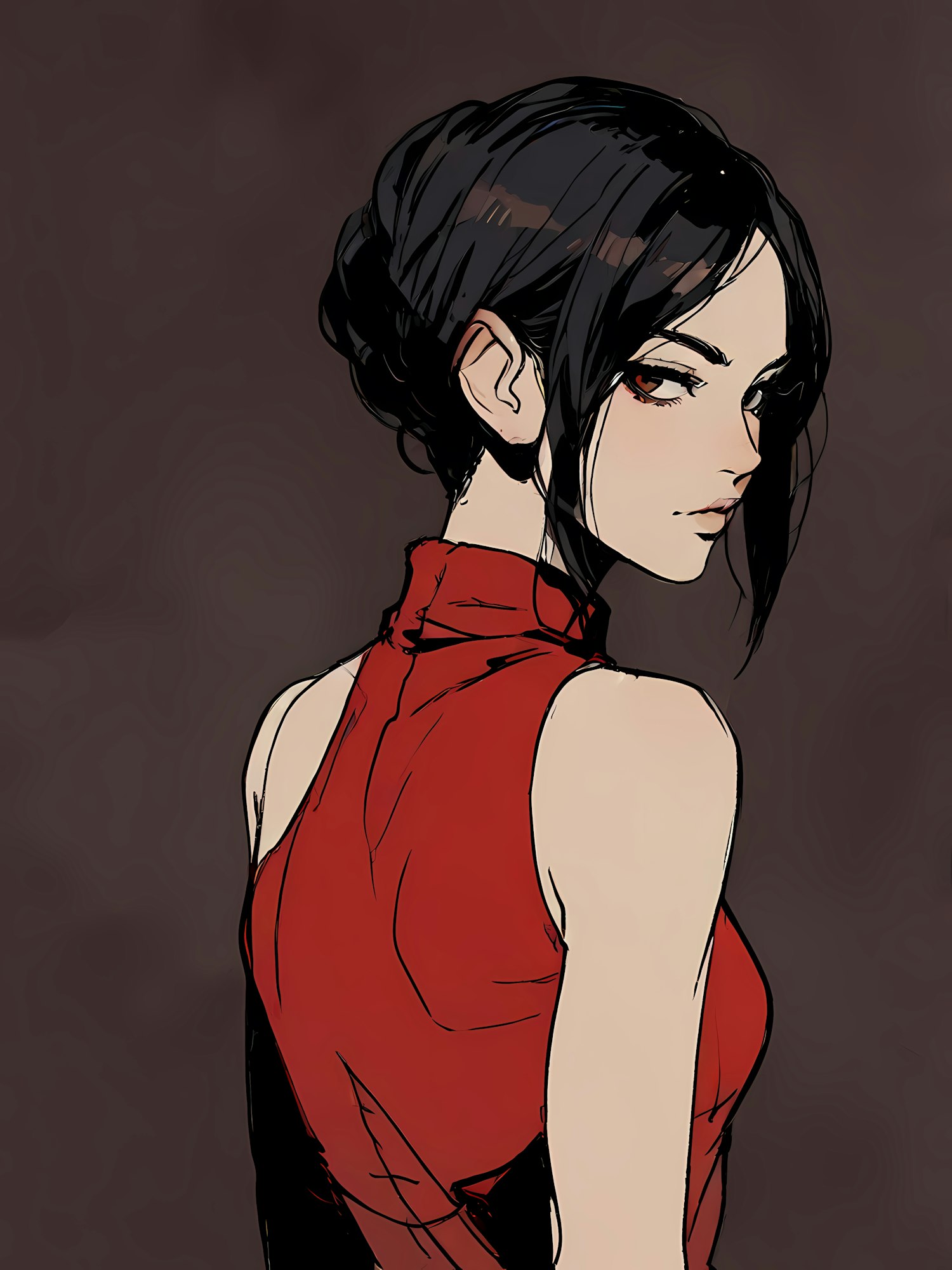 Stylized illustration of a woman in a red dress with dark hair, exuding elegance and mystery against a muted background.