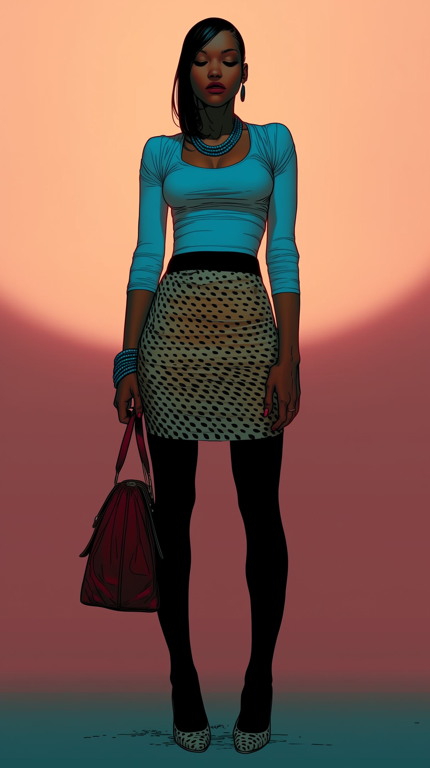 Stylized illustration of a fashionable woman in a polka-dot skirt and blue top, standing against a gradient background.