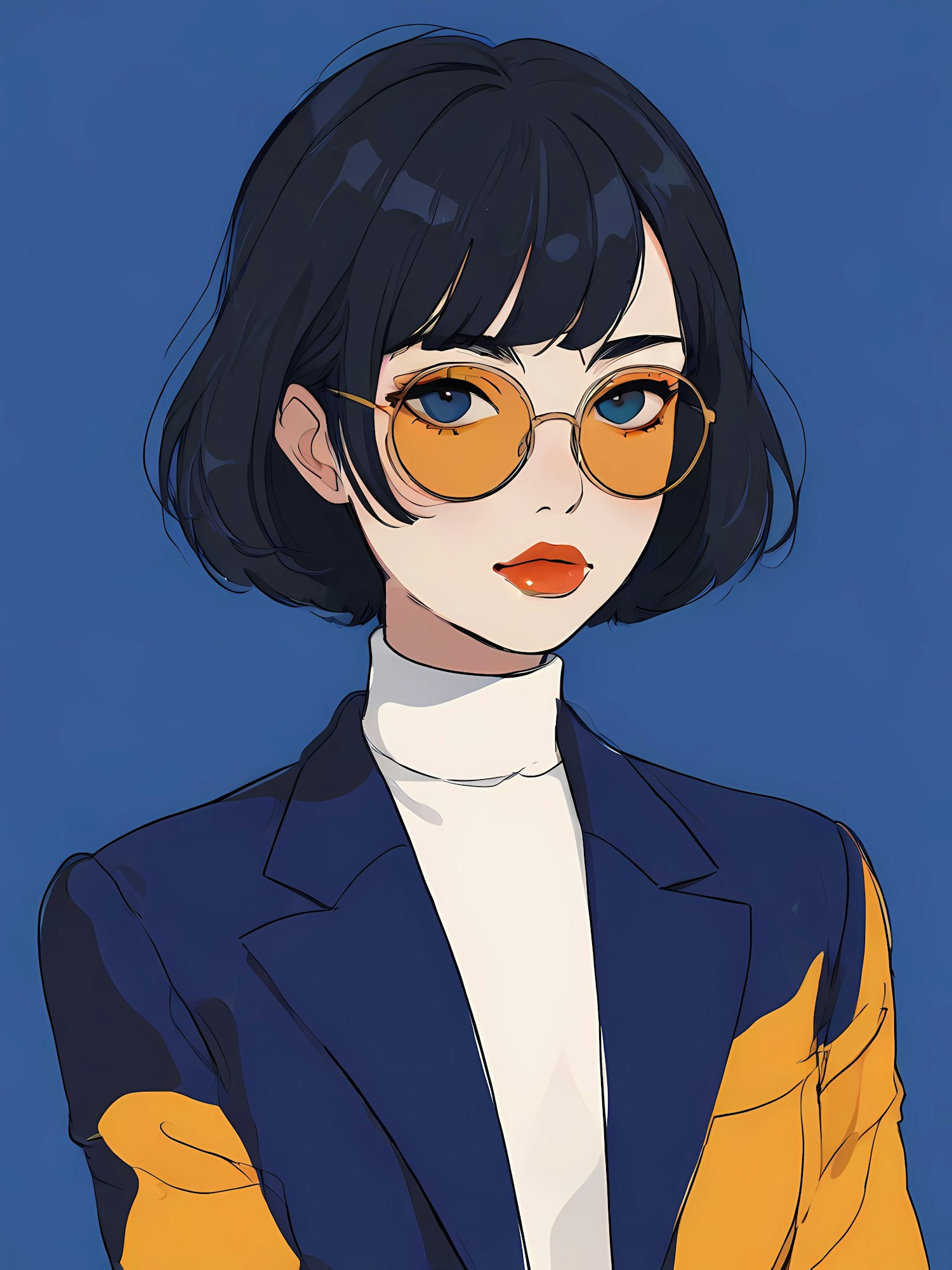 Stylized illustration of a woman with orange glasses, navy blazer, and yellow accents on a blue background. Modern and vibrant design.