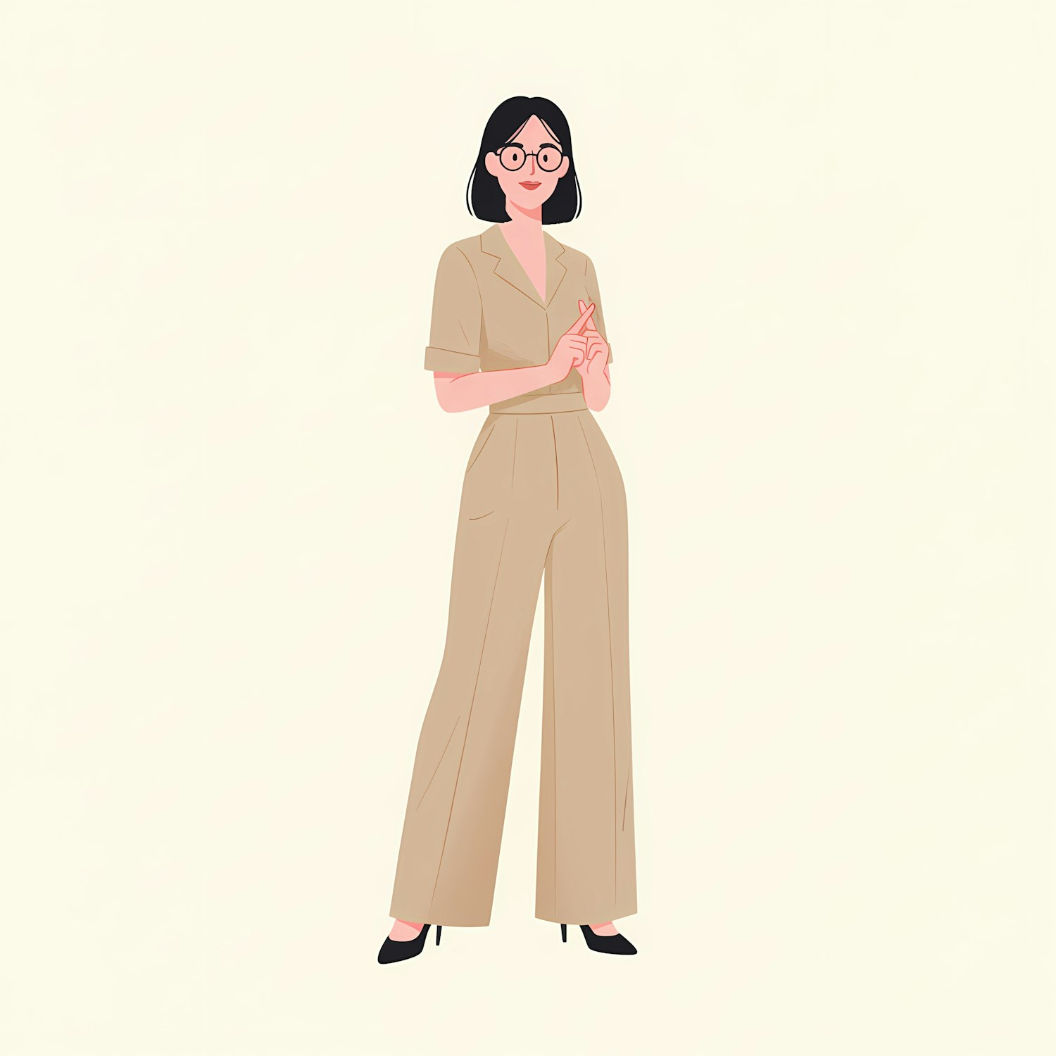 Stylized illustration of a woman in a beige pantsuit and glasses, standing confidently against a light background.
