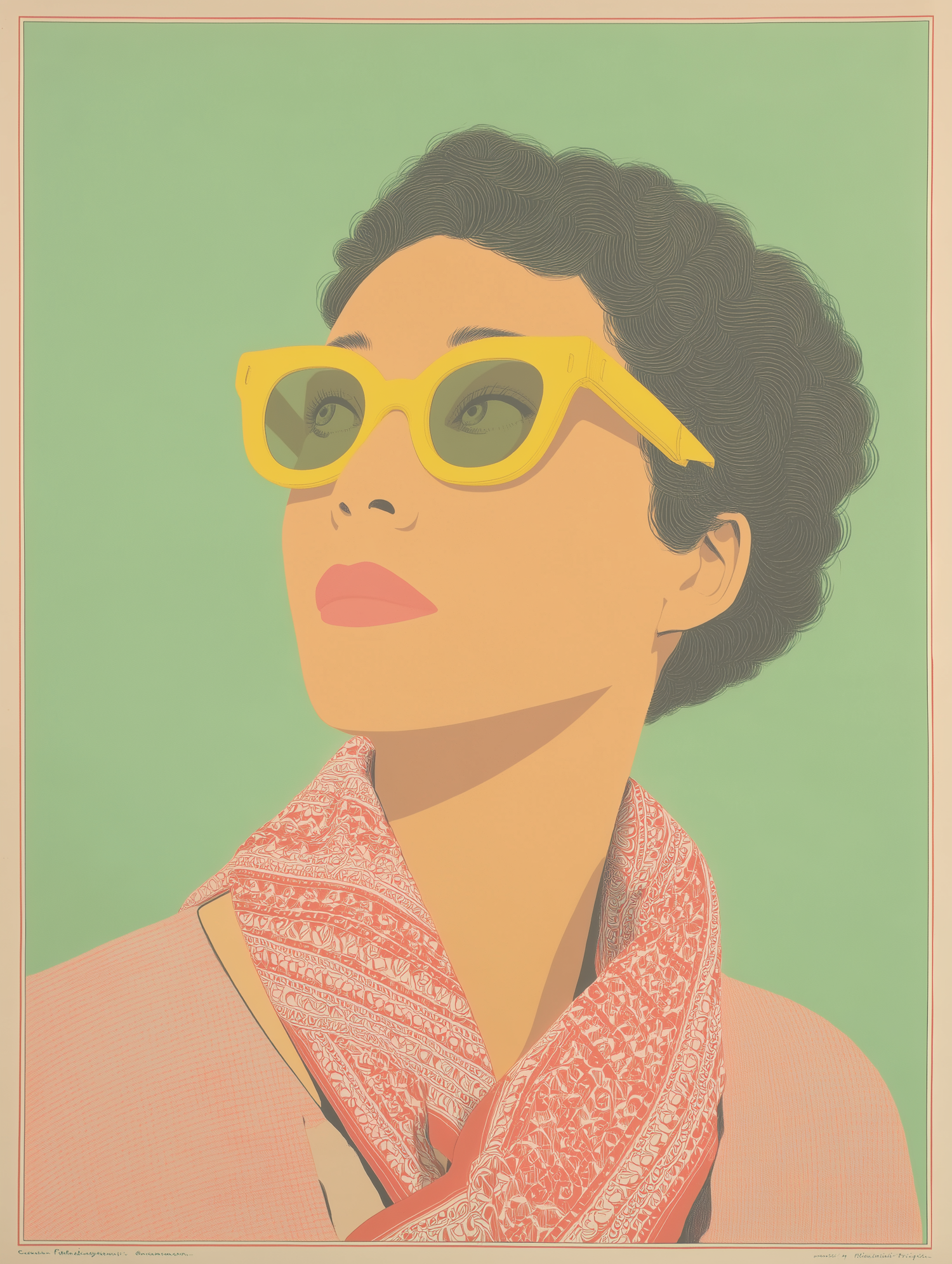 Stylized illustration of a woman in yellow sunglasses, a red patterned scarf, and a pastel green background. Retro and minimalist vibes.