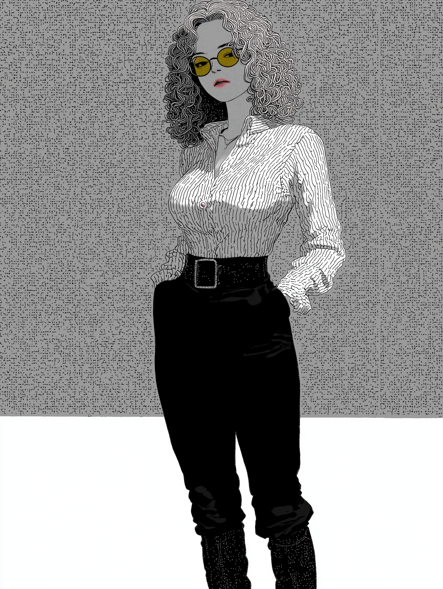 Stylized illustration of a woman in a striped shirt, black pants, and yellow glasses, set against a textured gray background.
