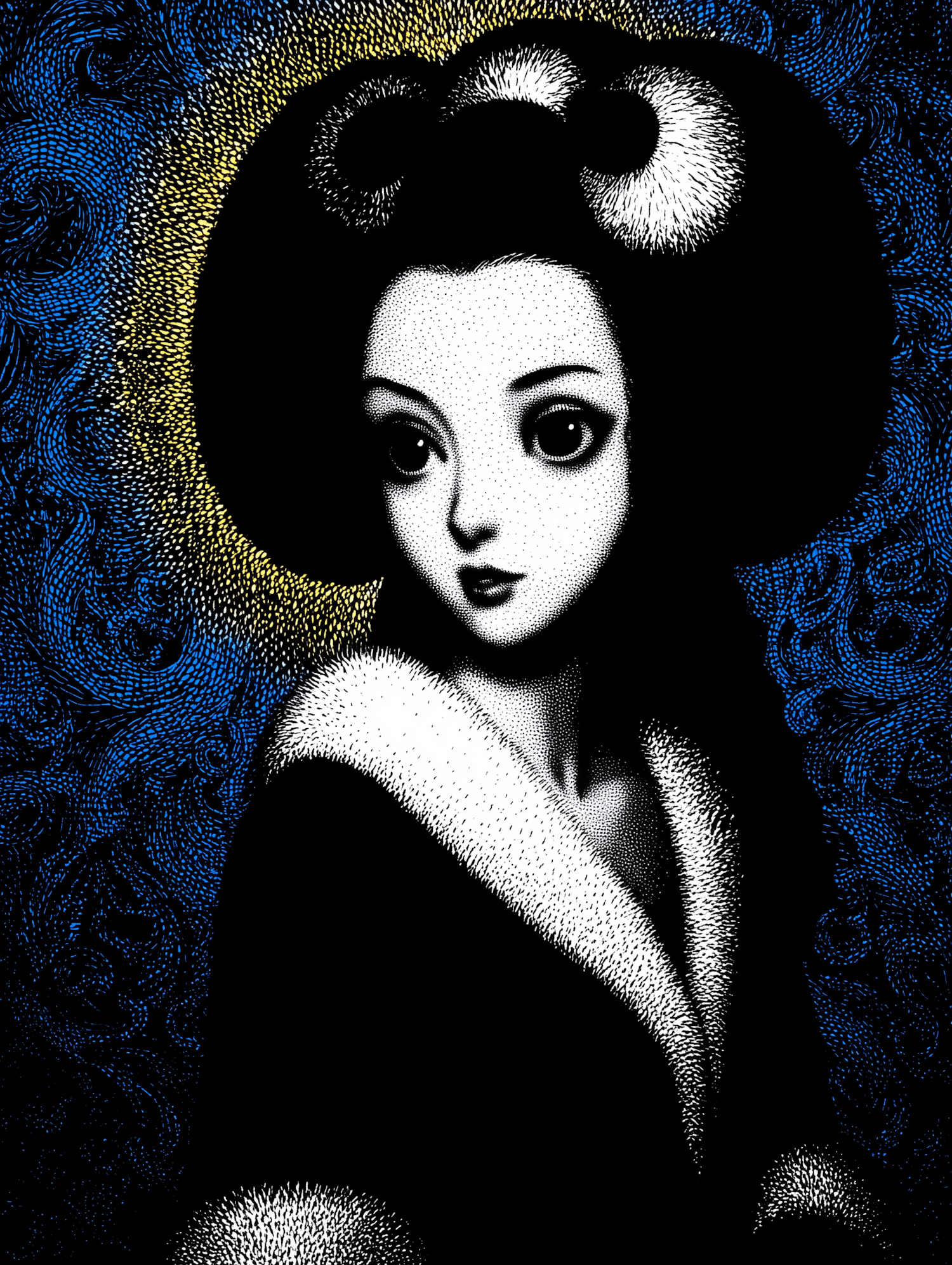 Stylized illustration of a woman with an elaborate updo, expressive eyes, and a fur-collared garment, set against a swirling blue and yellow background.