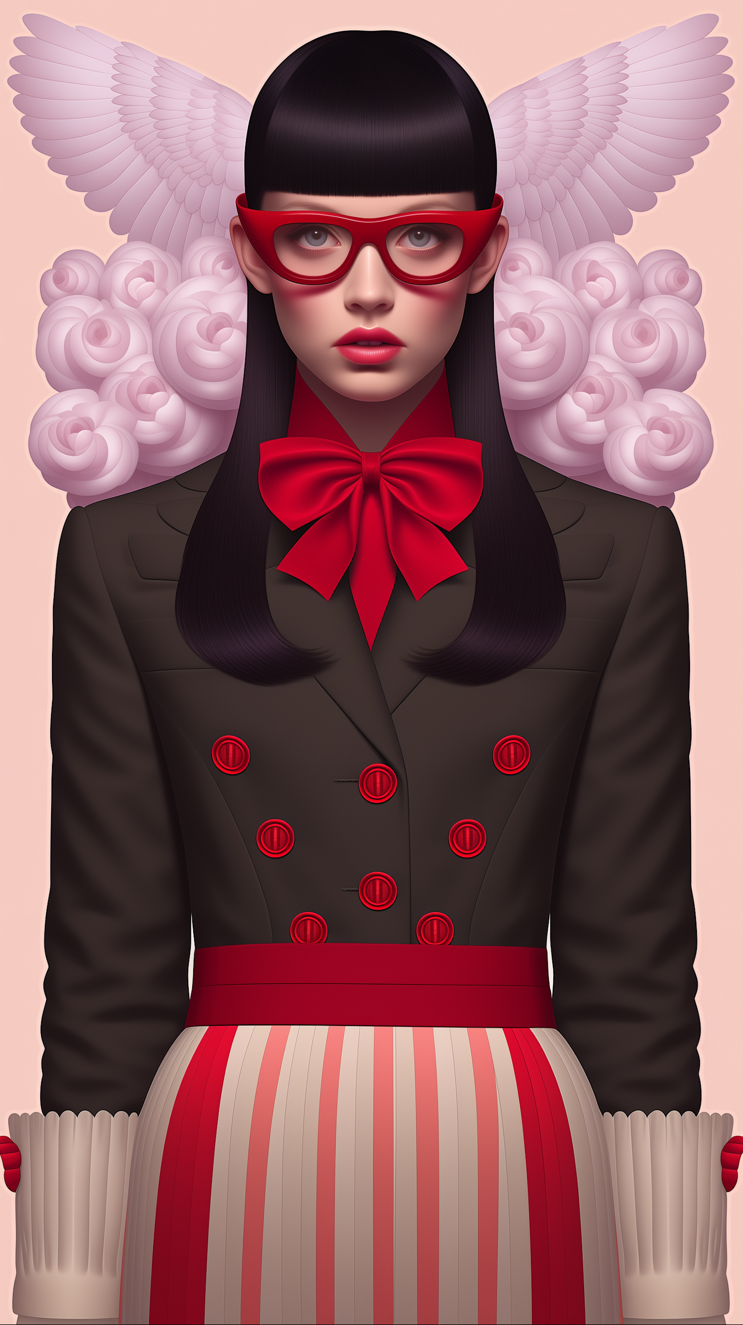 Stylized illustration of a woman in a red and black outfit with artistic elements like roses and wings in the background.
