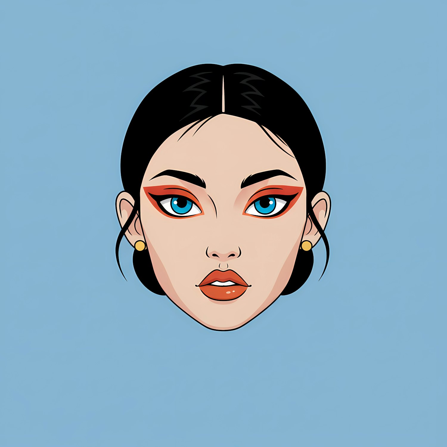 Stylized illustration of a woman's face with bold makeup, sleek black hair, and gold earrings on a light blue background.