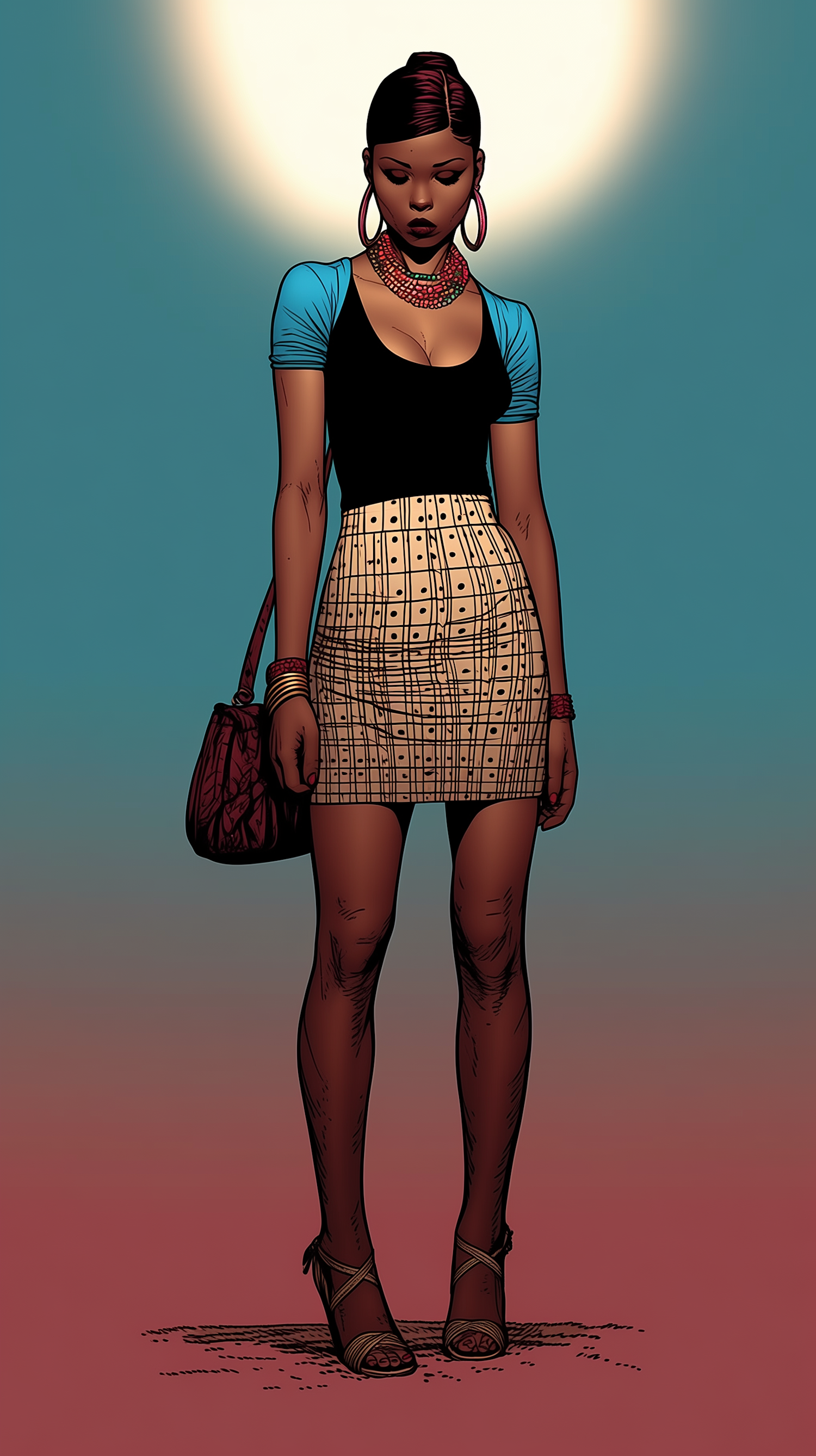 Stylized illustration of a woman in a patterned skirt and accessories, standing against a gradient background with a dramatic halo effect.