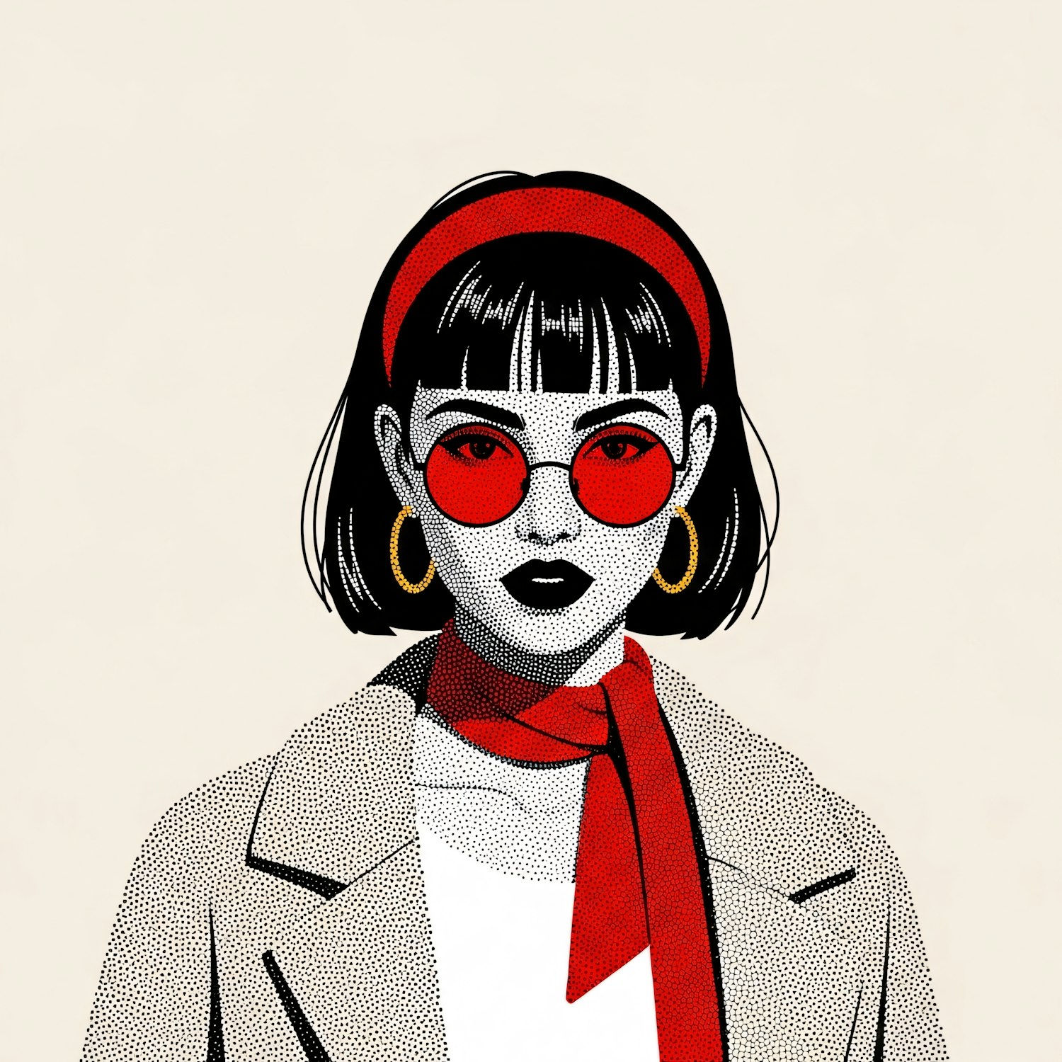Stylized illustration of a woman with red sunglasses, a red scarf, and a beige trench coat, set against a light beige background.