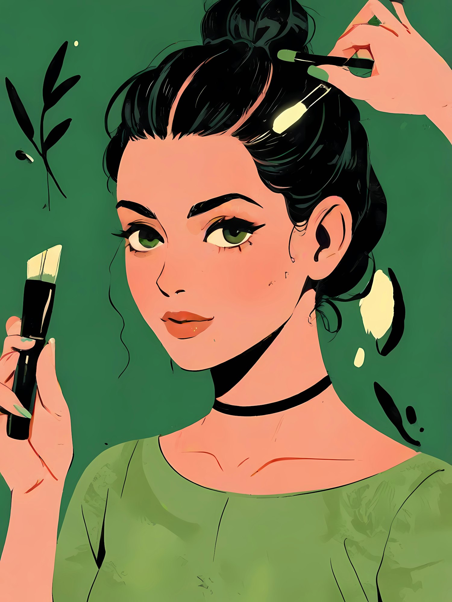 Stylized illustration of a woman with green eyes, black hair in a bun, wearing a green top, applying makeup with a brush on a green background.