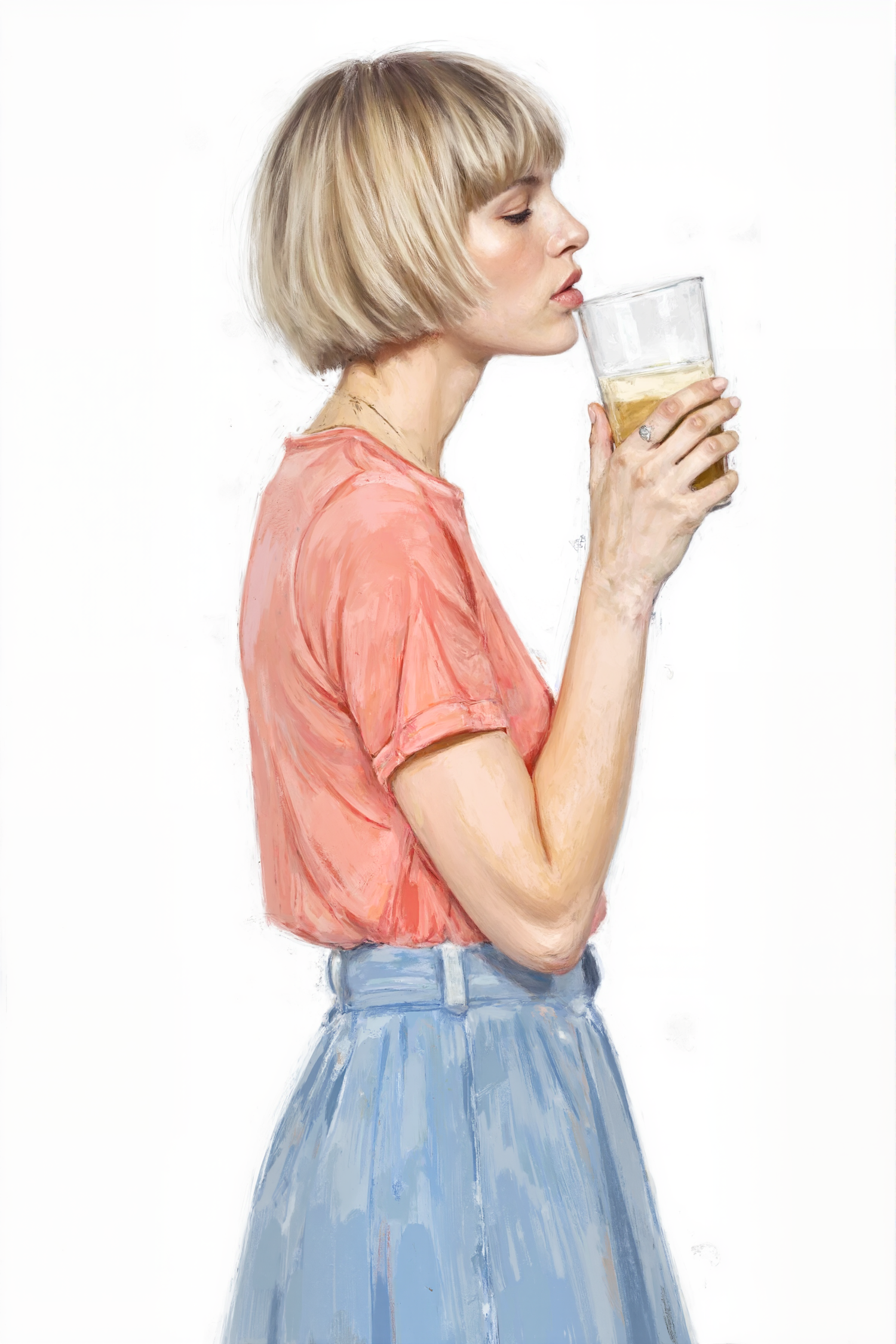 Stylized illustration of a blonde woman in a coral shirt and blue skirt, holding a glass of drink against a white background.