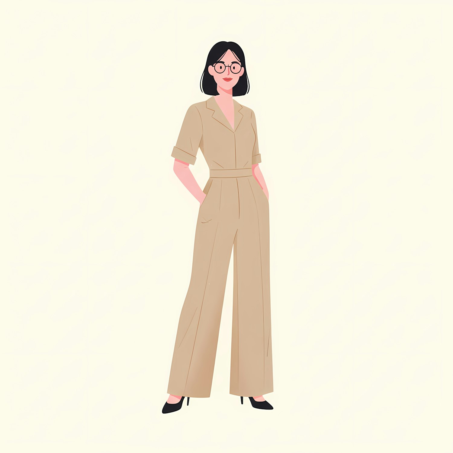 Stylized illustration of a woman in a beige jumpsuit with glasses, standing confidently against a light cream background.