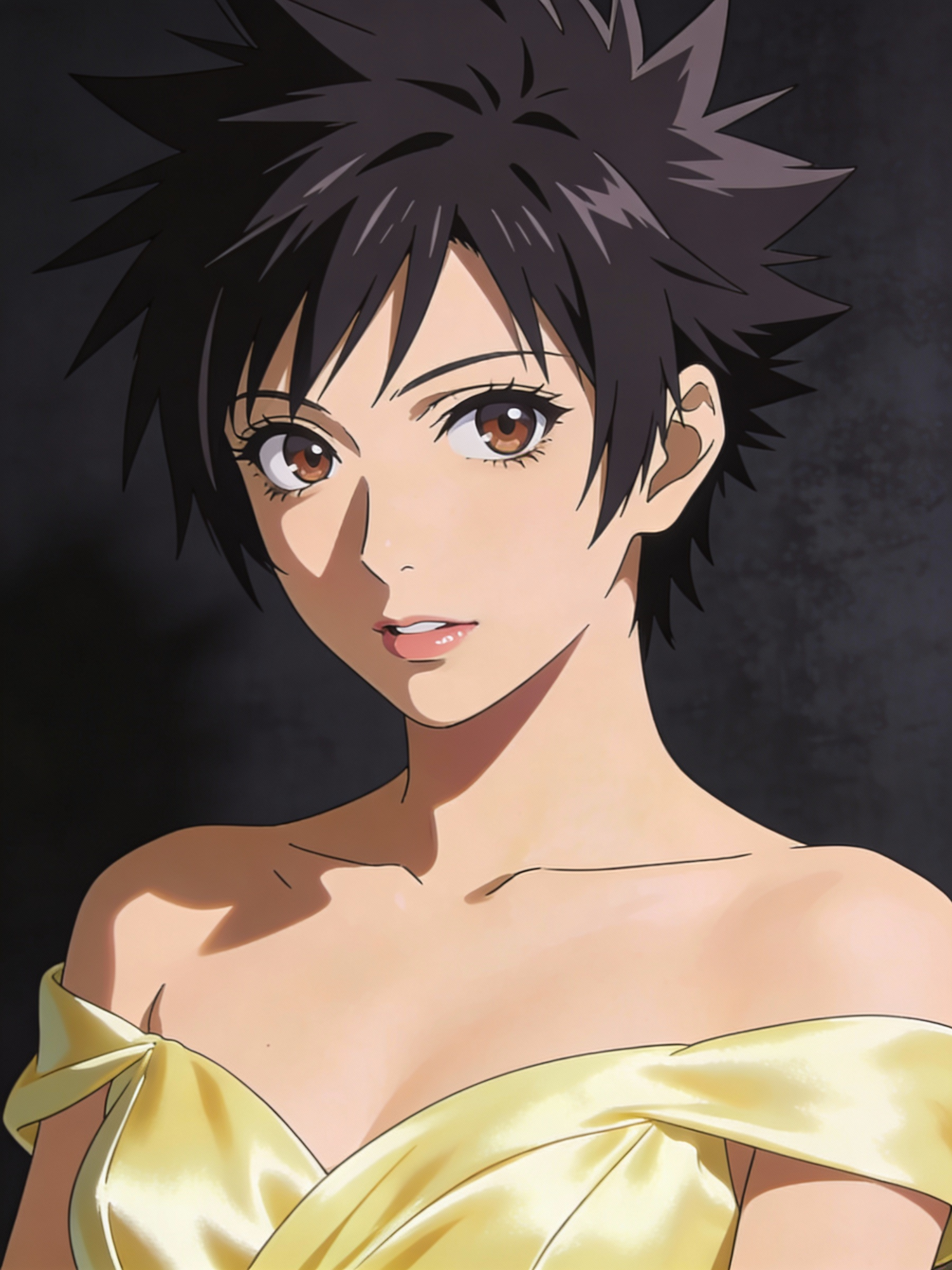Anime-style portrait of a young woman with short black hair, wearing a yellow dress, set against a dark background.