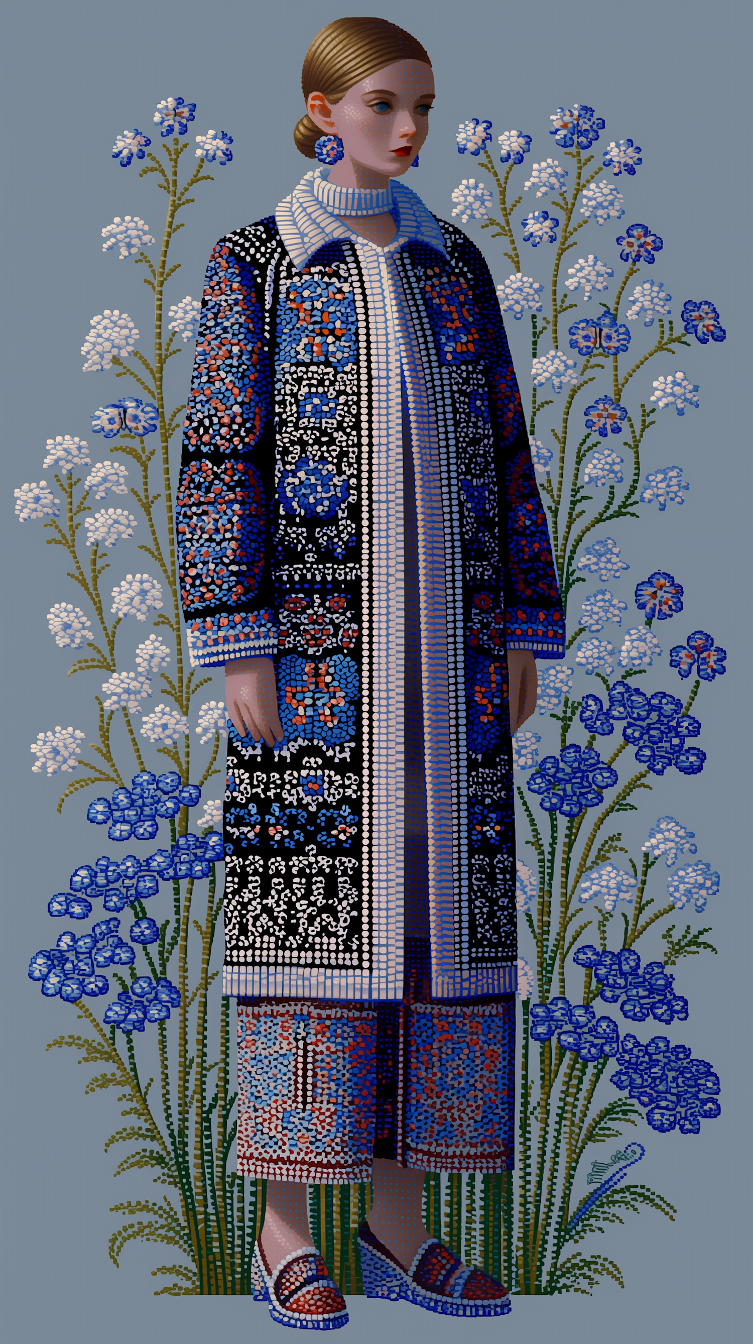 Stylized illustration of a woman in a patterned outfit with floral background, showcasing intricate designs and vibrant colors.