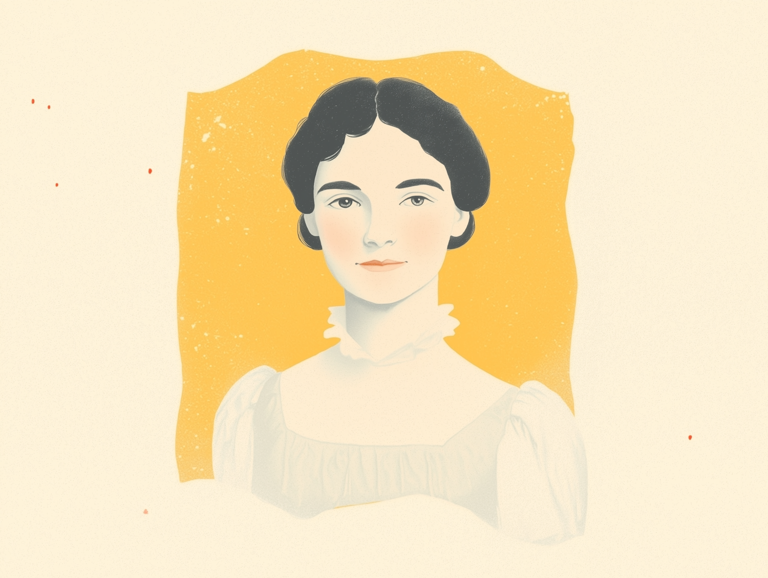 Minimalist illustration of a young woman with dark hair, wearing a vintage white blouse, set against a warm yellow textured background.