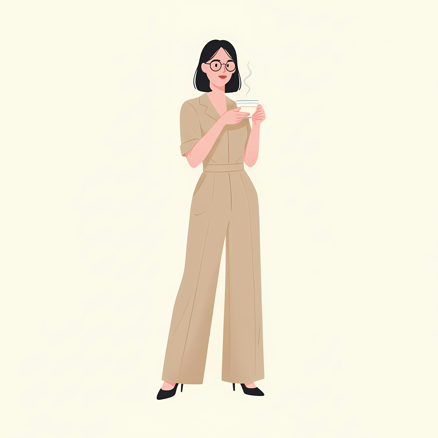 Stylized illustration of a woman in a beige jumpsuit holding a steaming cup, exuding a calm and relaxed vibe.