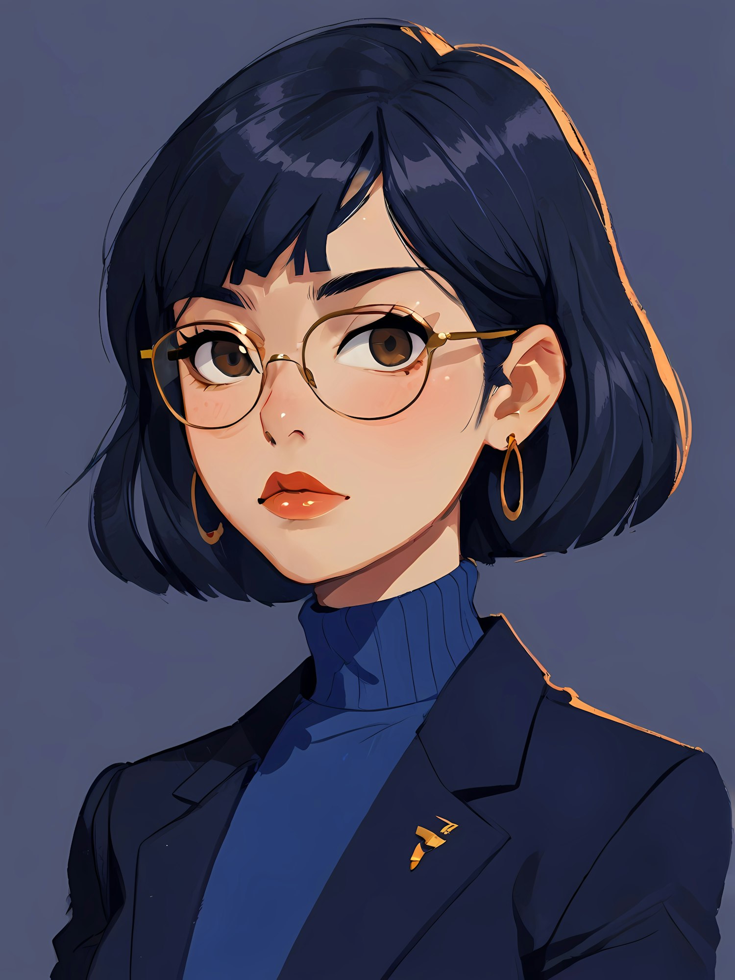 Stylized illustration of a woman with short dark blue hair, gold glasses, and a navy blazer, exuding a modern and professional vibe.