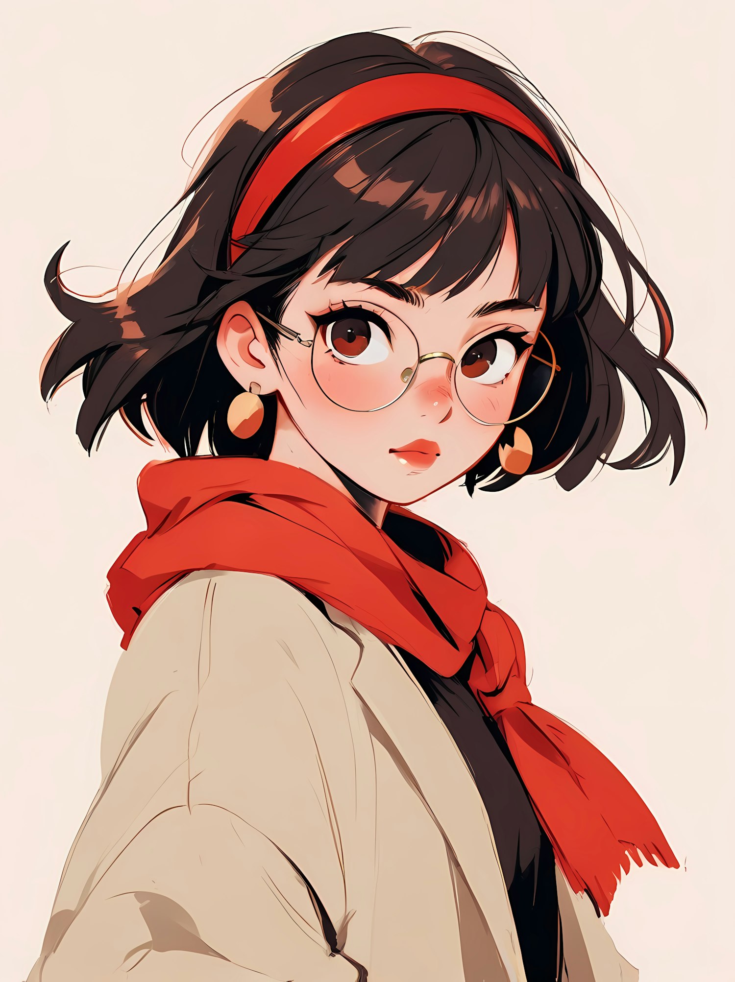 Stylized illustration of a young woman with glasses, red scarf, and headband, exuding charm with her expressive eyes and warm tones.