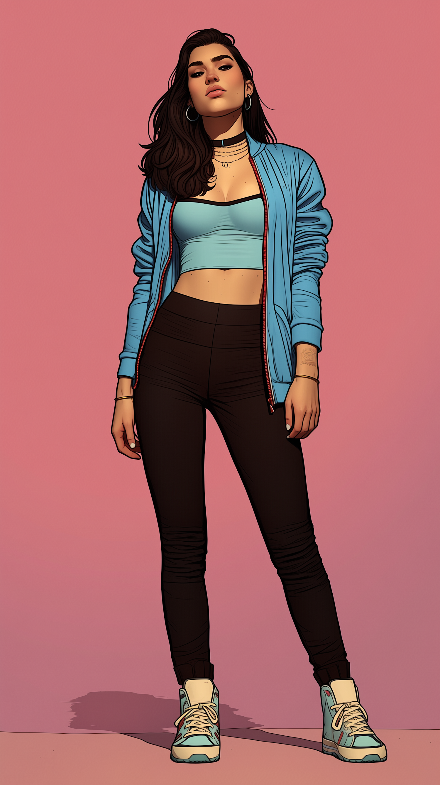 Stylized illustration of a confident young woman in casual attire against a pink background, showcasing a modern and vibrant aesthetic.