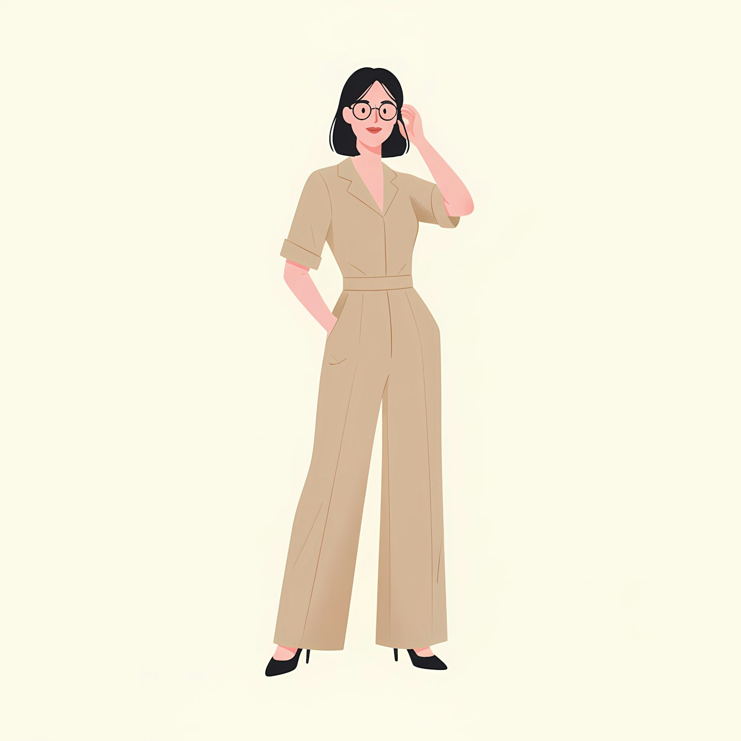 Stylized illustration of a woman in a beige jumpsuit with glasses, standing confidently against a light background.
