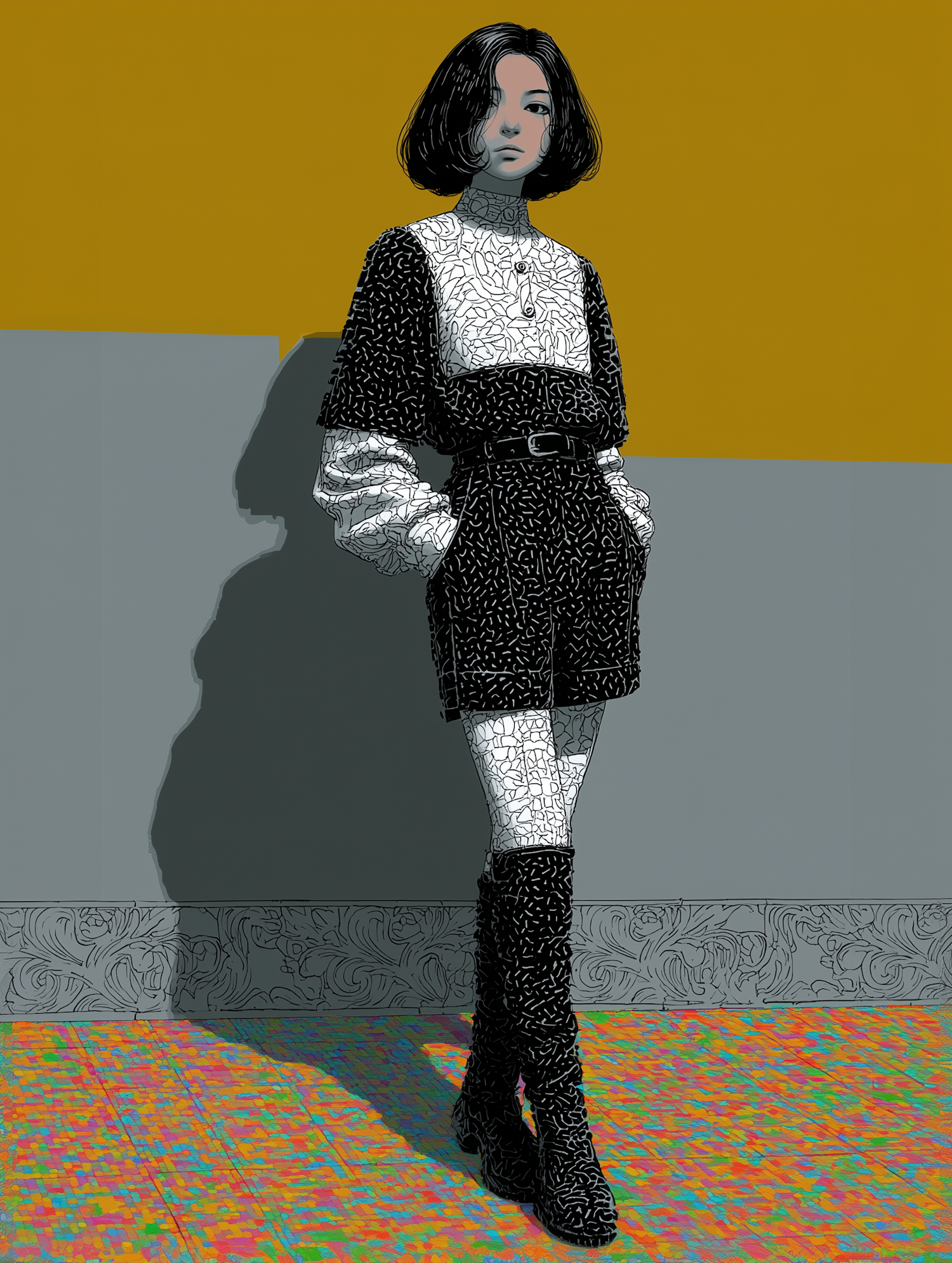 Stylized illustration of a woman in a patterned outfit, standing against a mustard and gray background with a colorful mosaic floor.