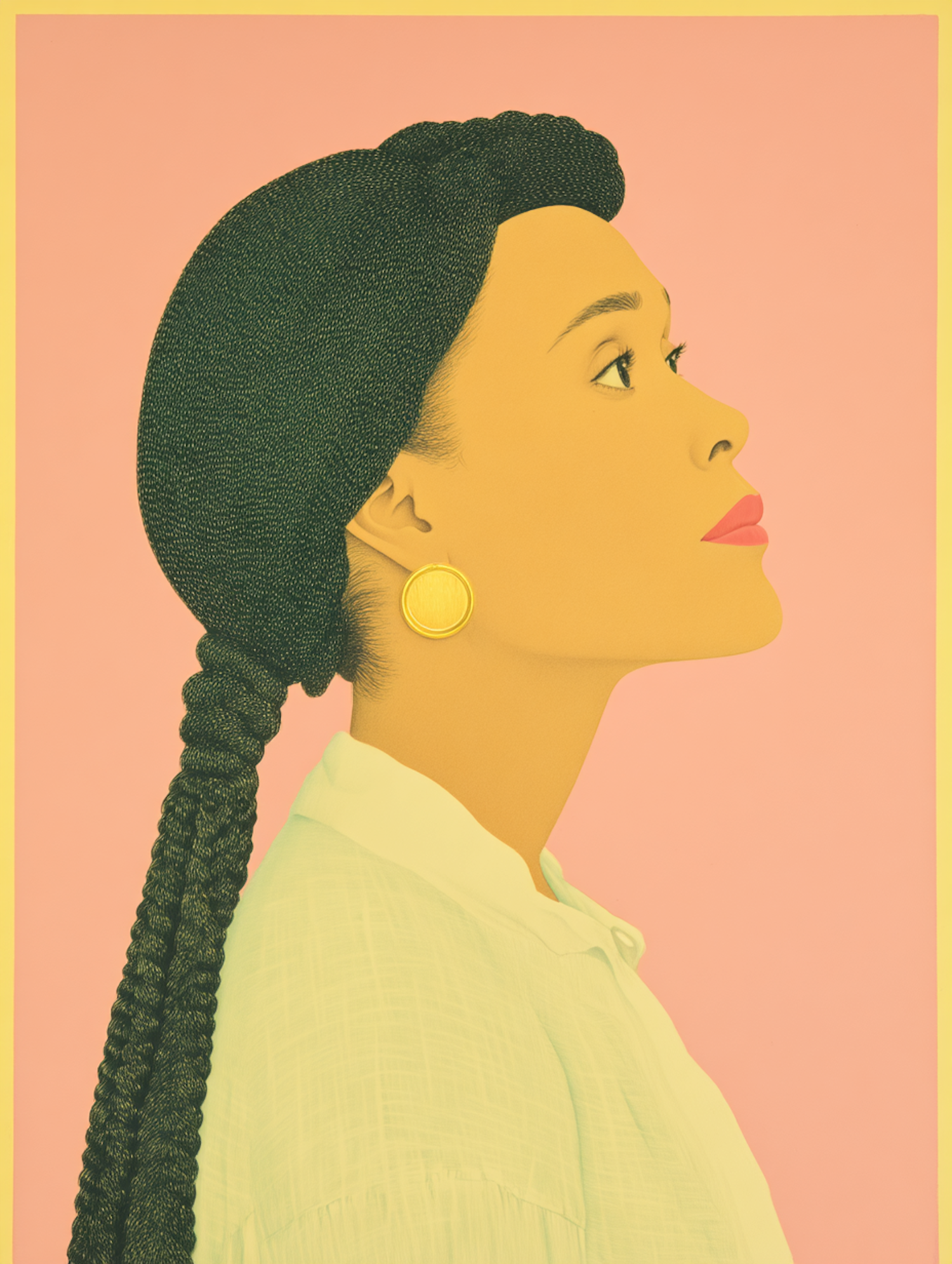 Stylized illustration of a woman with braided hair, gold earrings, and a white blouse against a pink background with a yellow border.