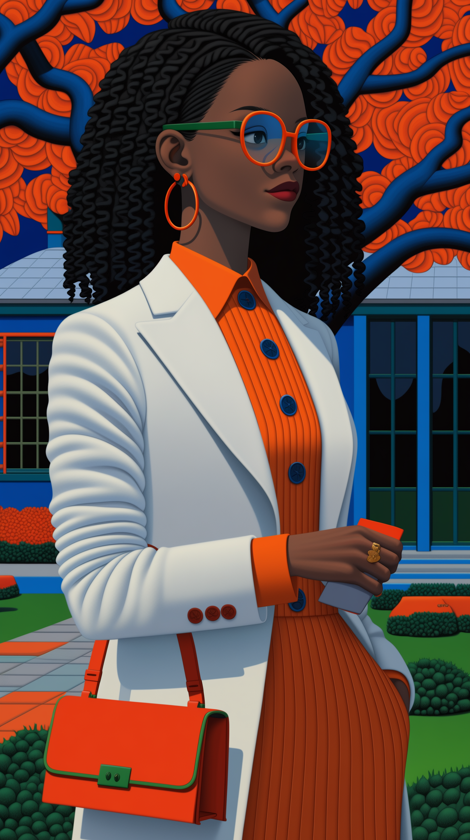 Stylized illustration of a fashionable woman in bold orange and white attire, set against a vibrant, colorful background.