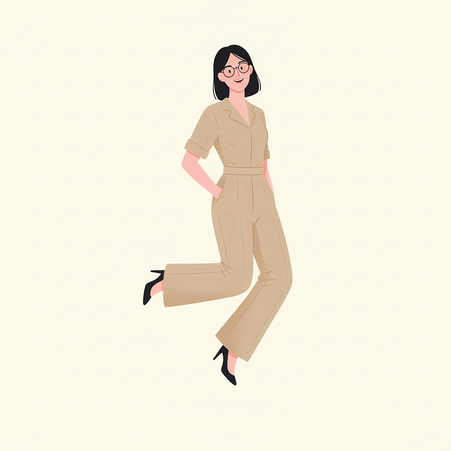 Stylized illustration of a woman in a beige jumpsuit and black heels, with short black hair and glasses, on a light background.