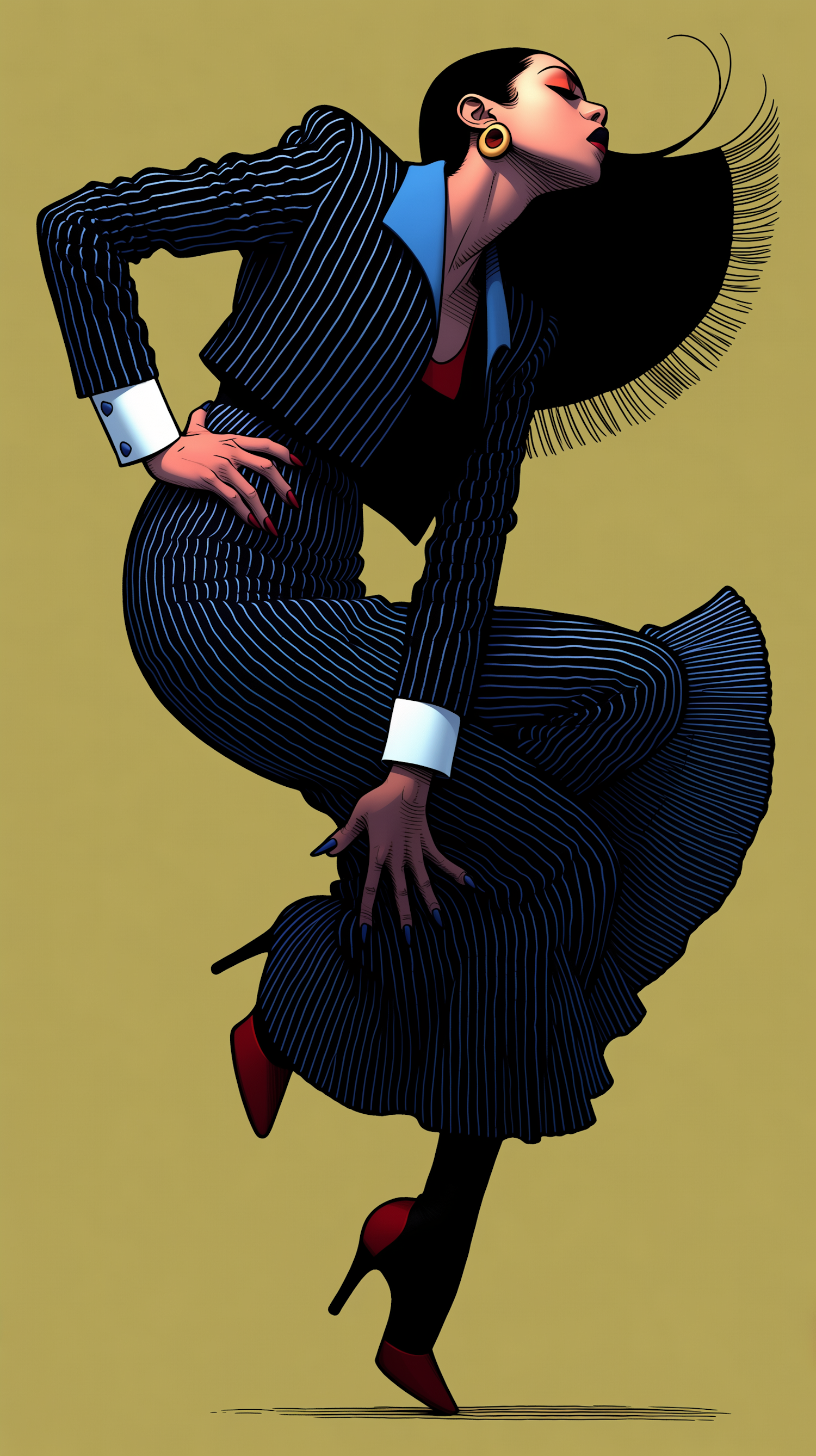 Stylized illustration of a woman in a pinstriped suit and red heels, striking a dynamic pose against a muted yellow background.
