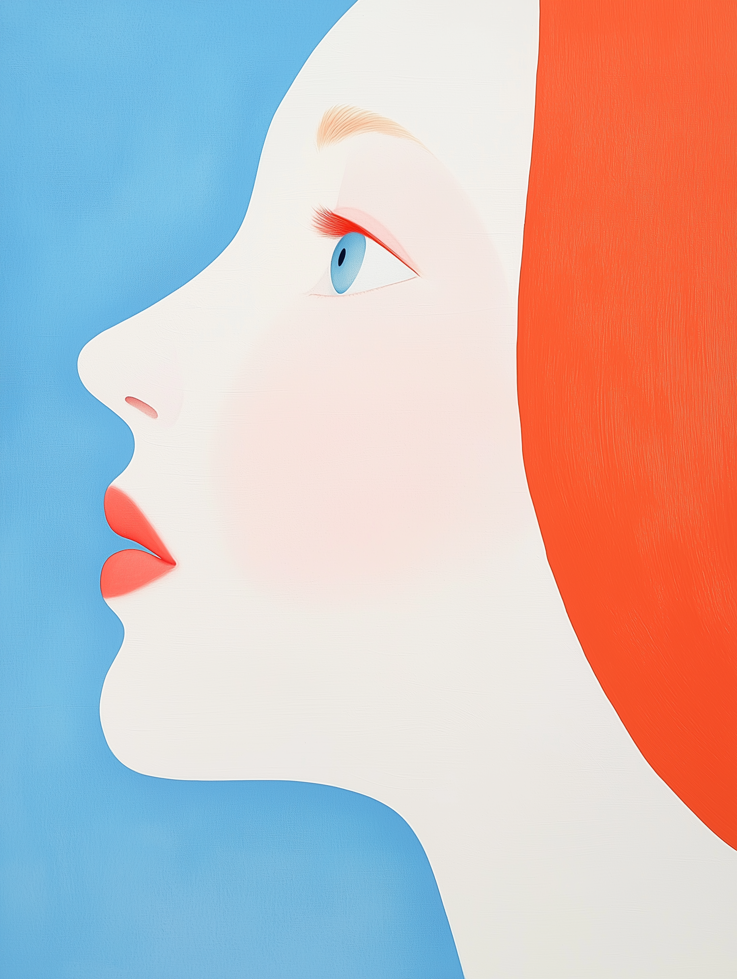 Minimalist side profile of a woman with orange-red hair, blue eyes, and matching lips on a solid blue background.