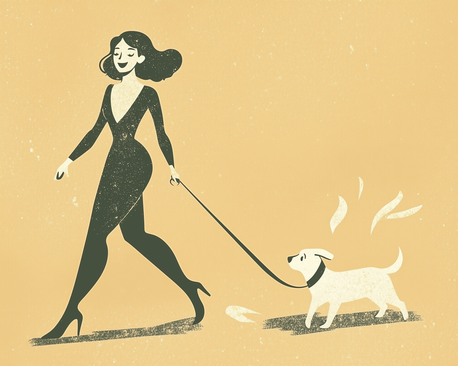 Stylized illustration of a woman in a black dress walking a small white dog on a yellow background.
