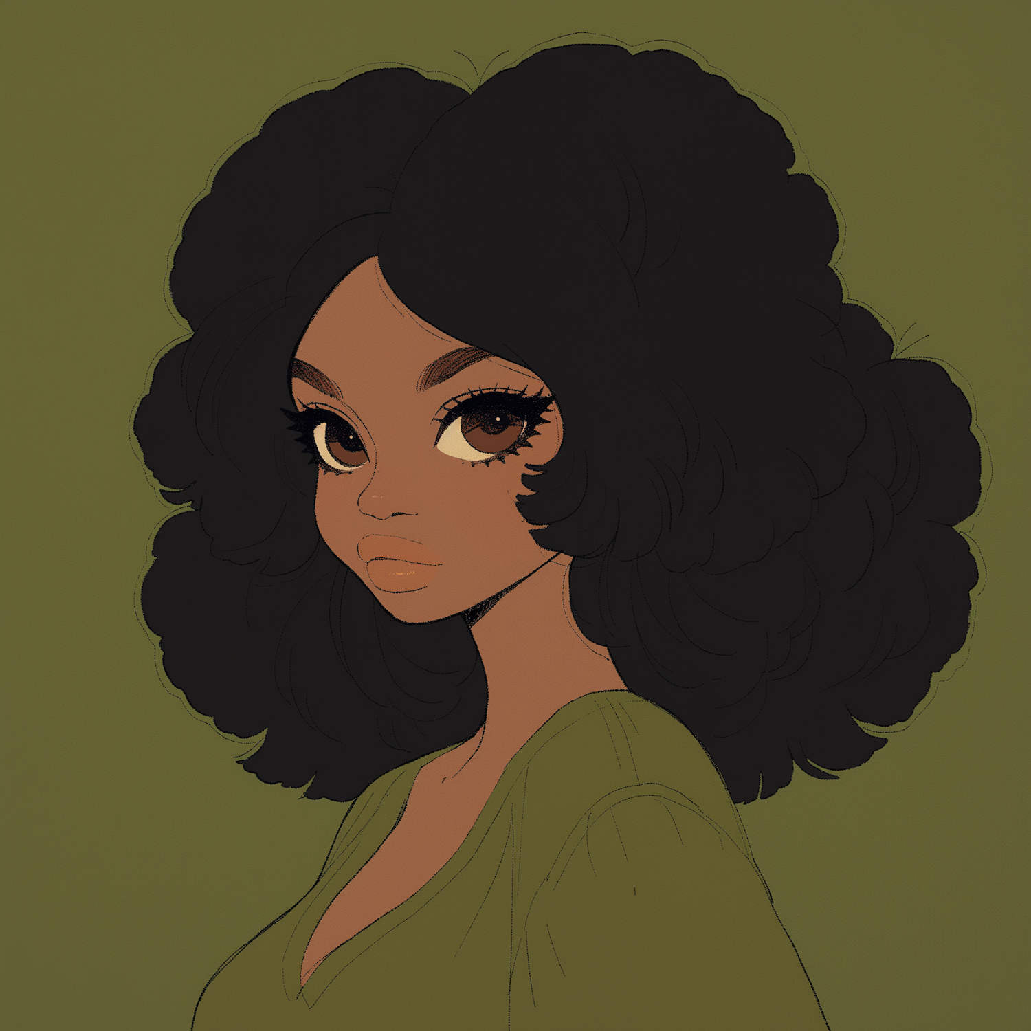 Stylized illustration of a woman with curly hair and expressive eyes on an olive green background, exuding elegance and confidence.