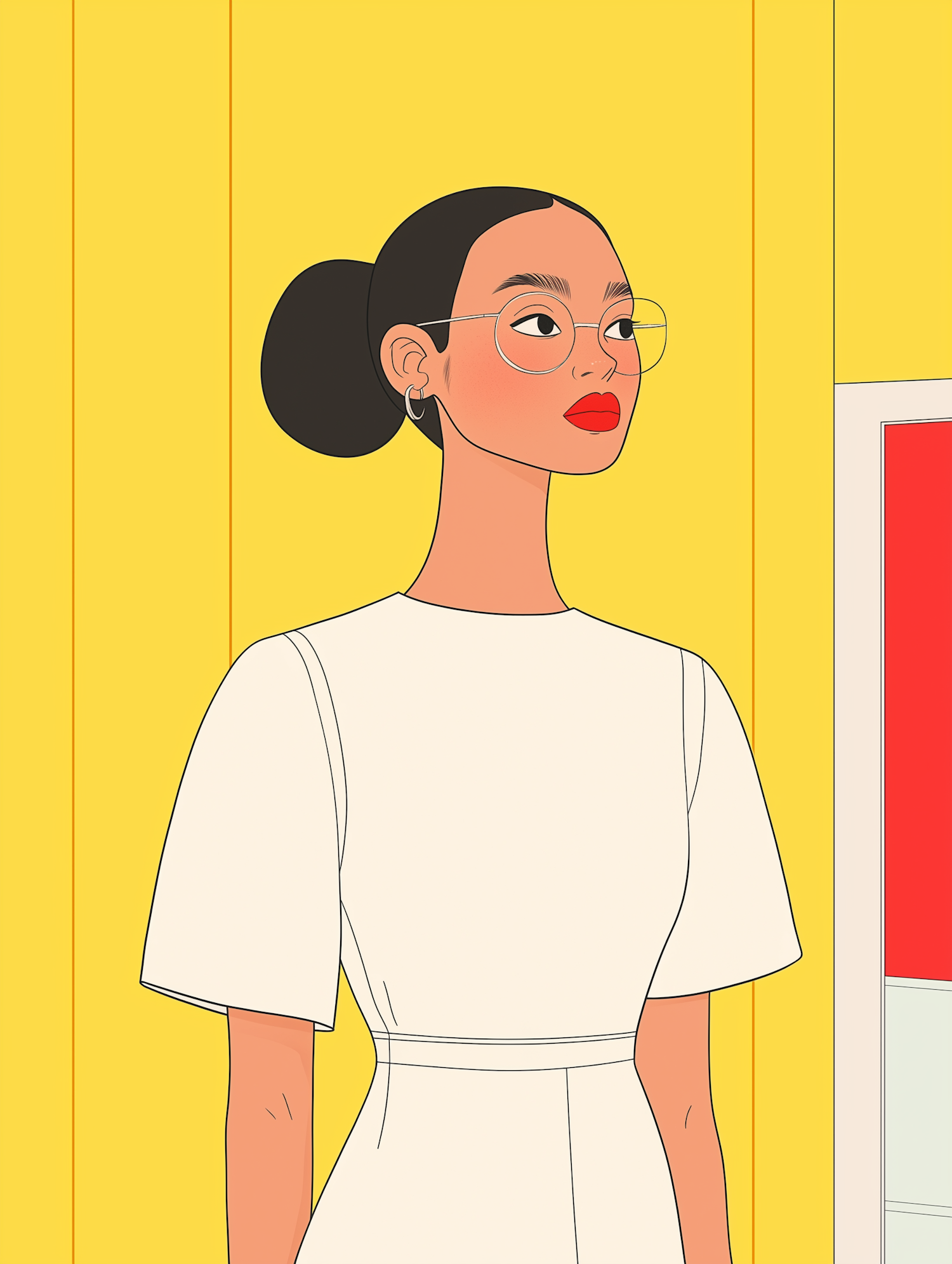 Stylized illustration of a woman with glasses and red lipstick against a bright yellow background.