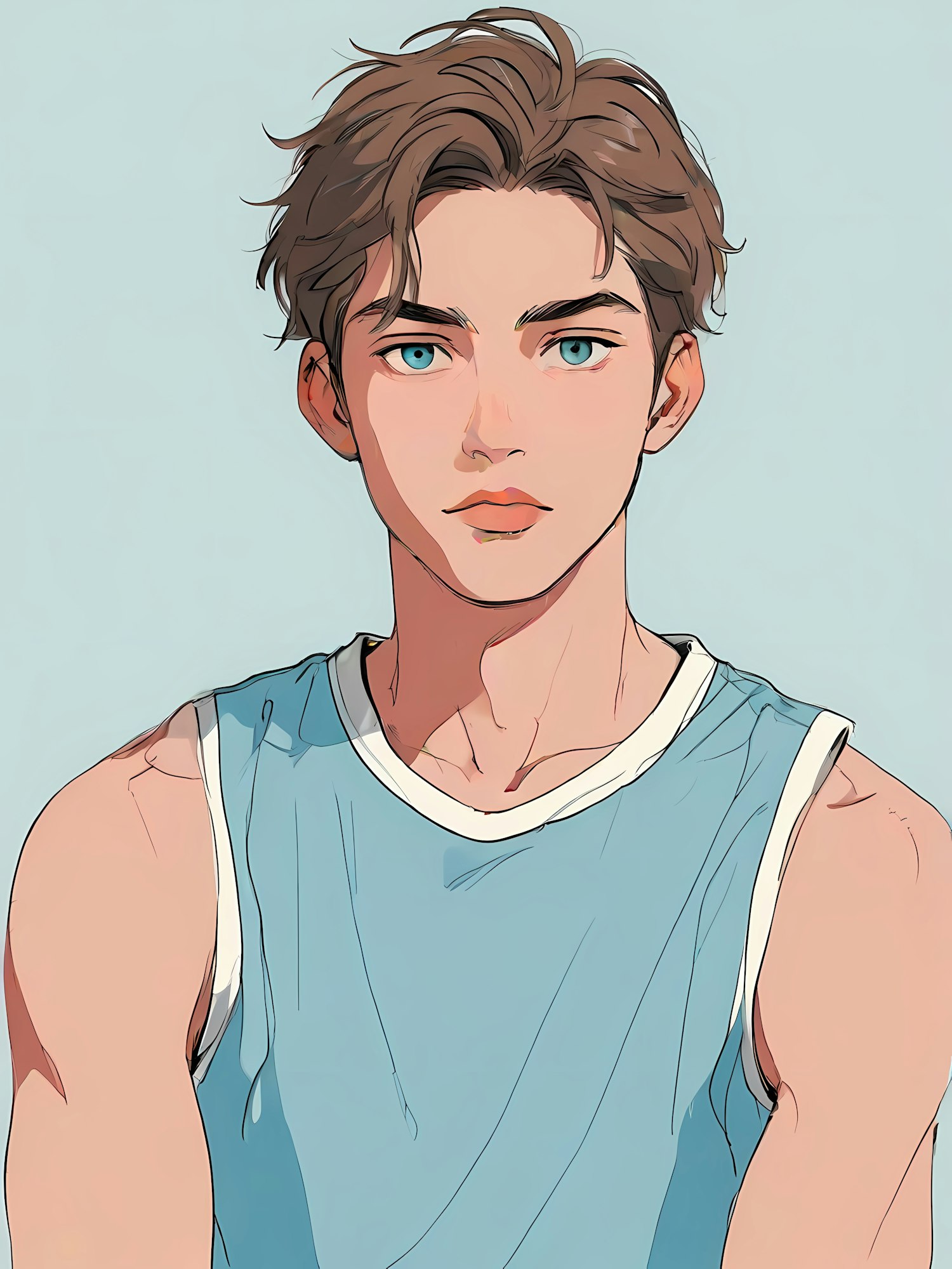 Stylized illustration of a young man with blue eyes, brown hair, and a light blue sleeveless shirt against a pale blue background.