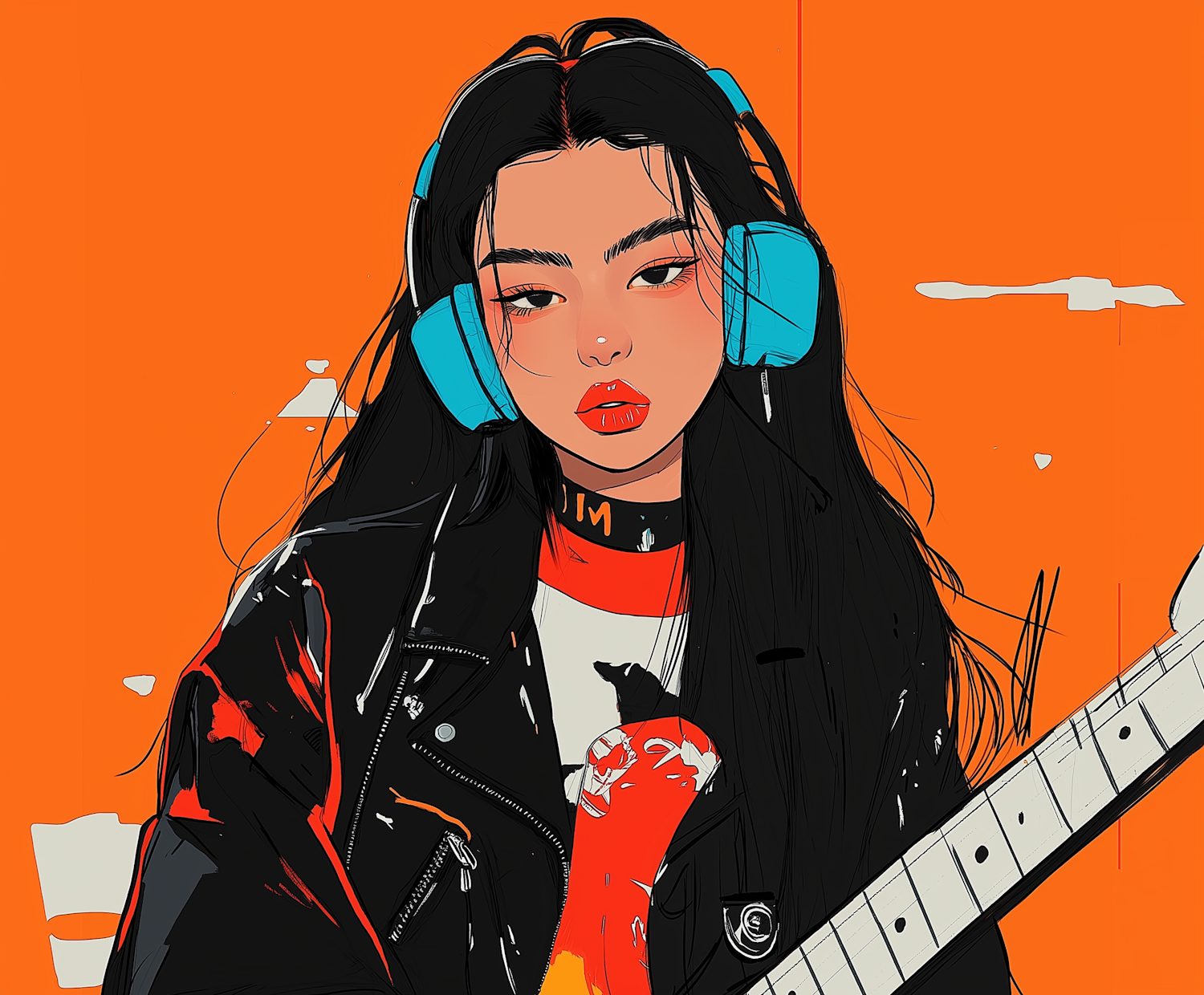 Edgy illustration of a woman with blue headphones and a guitar against a vibrant orange background.