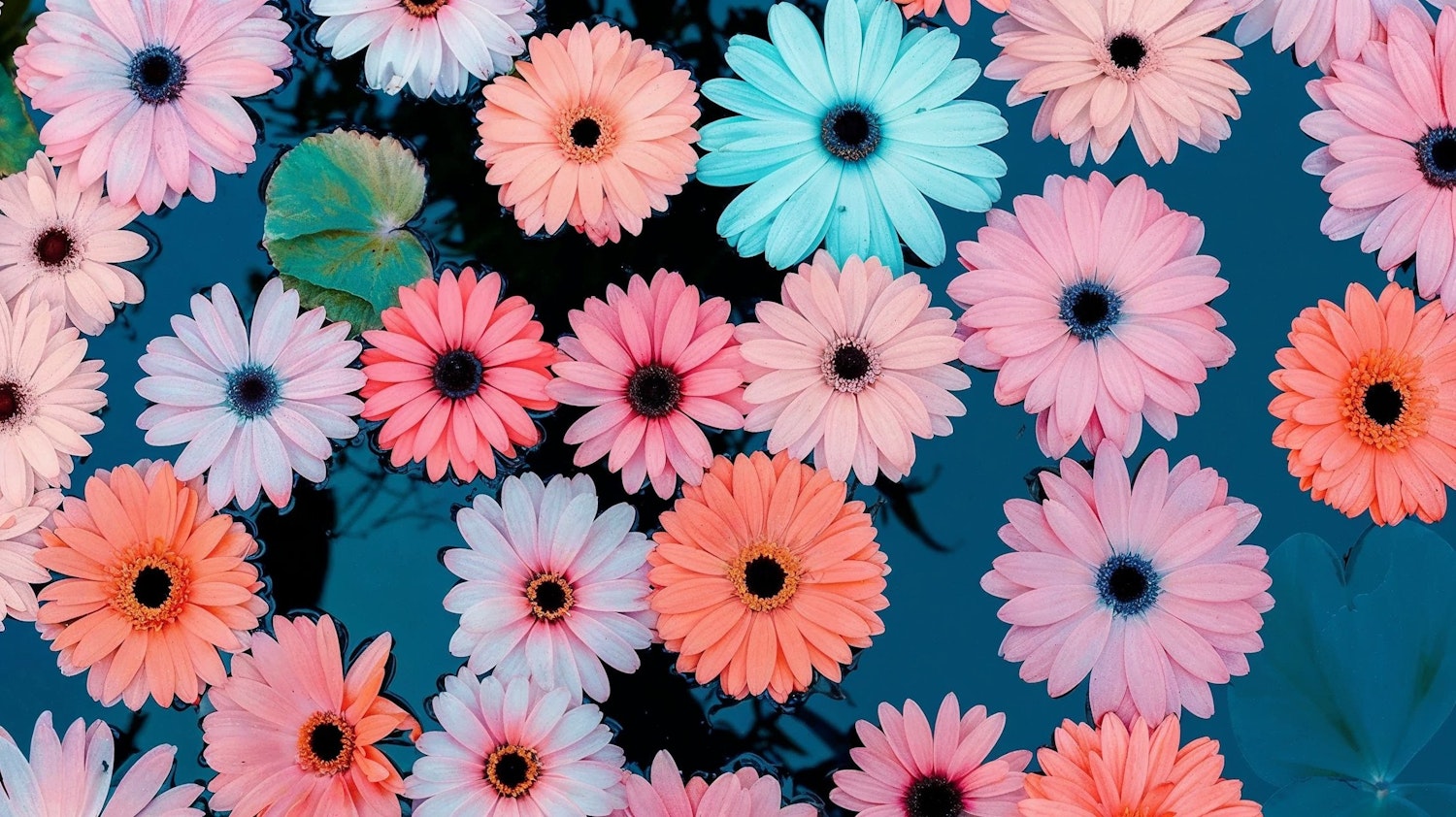 Colorful daisy-like flowers in pink, orange, and blue float on dark water, creating a serene and vibrant scene.