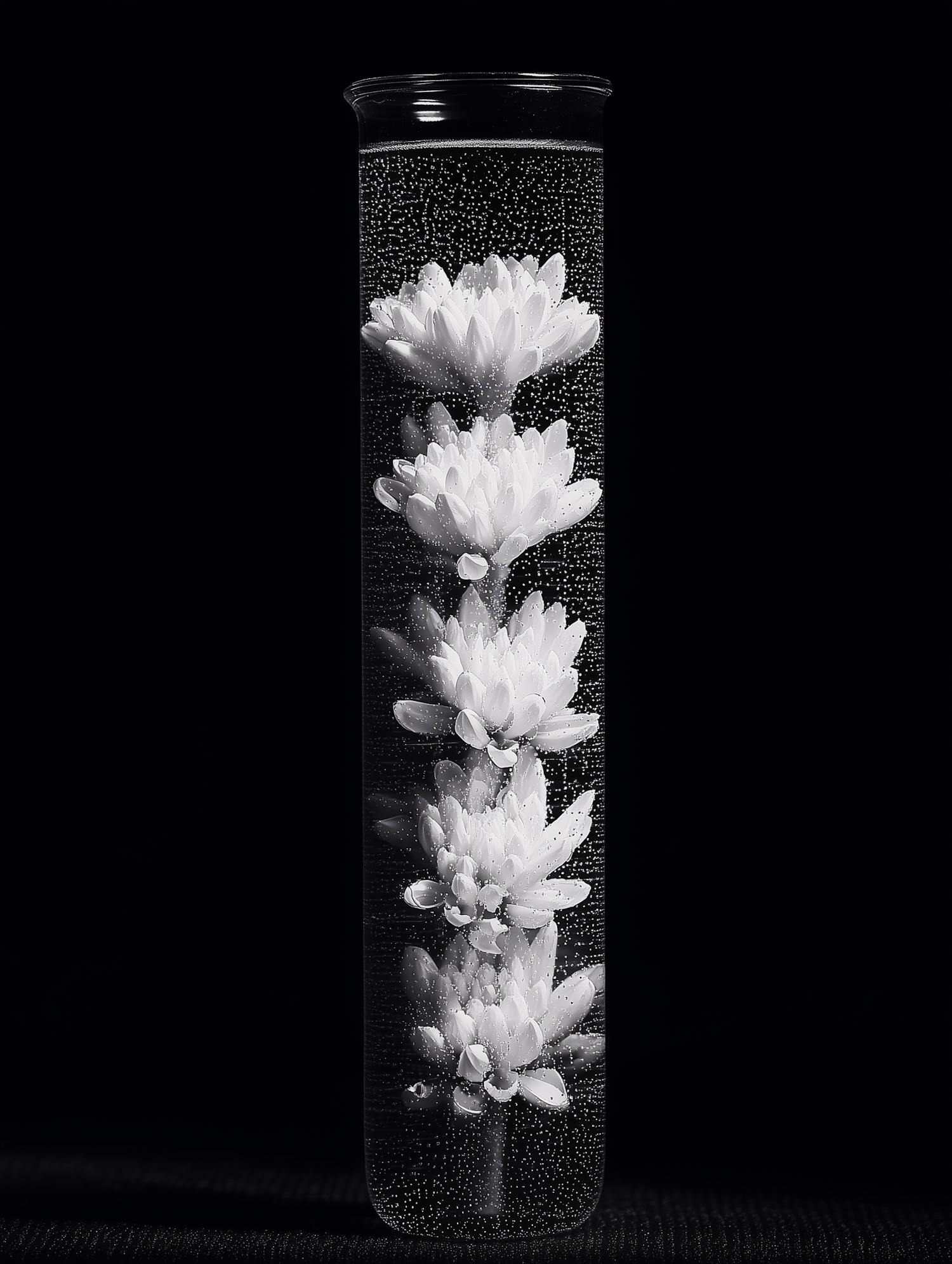 A tall glass cylinder with white flowers submerged in liquid, surrounded by air bubbles, set against a black background.
