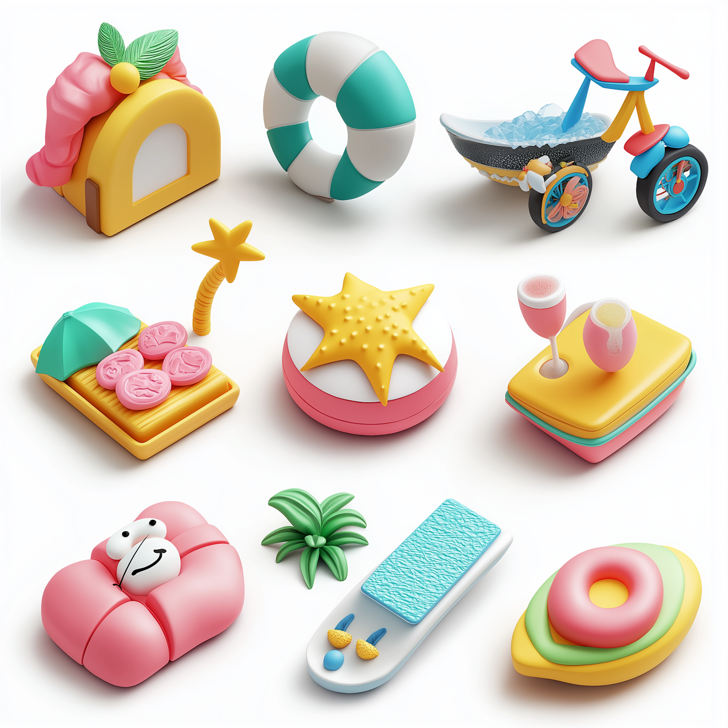 Playful 3D summer-themed objects like a beach hut, lifebuoy, tricycle, starfish, and more in pastel colors. Perfect for fun, creative vibes!